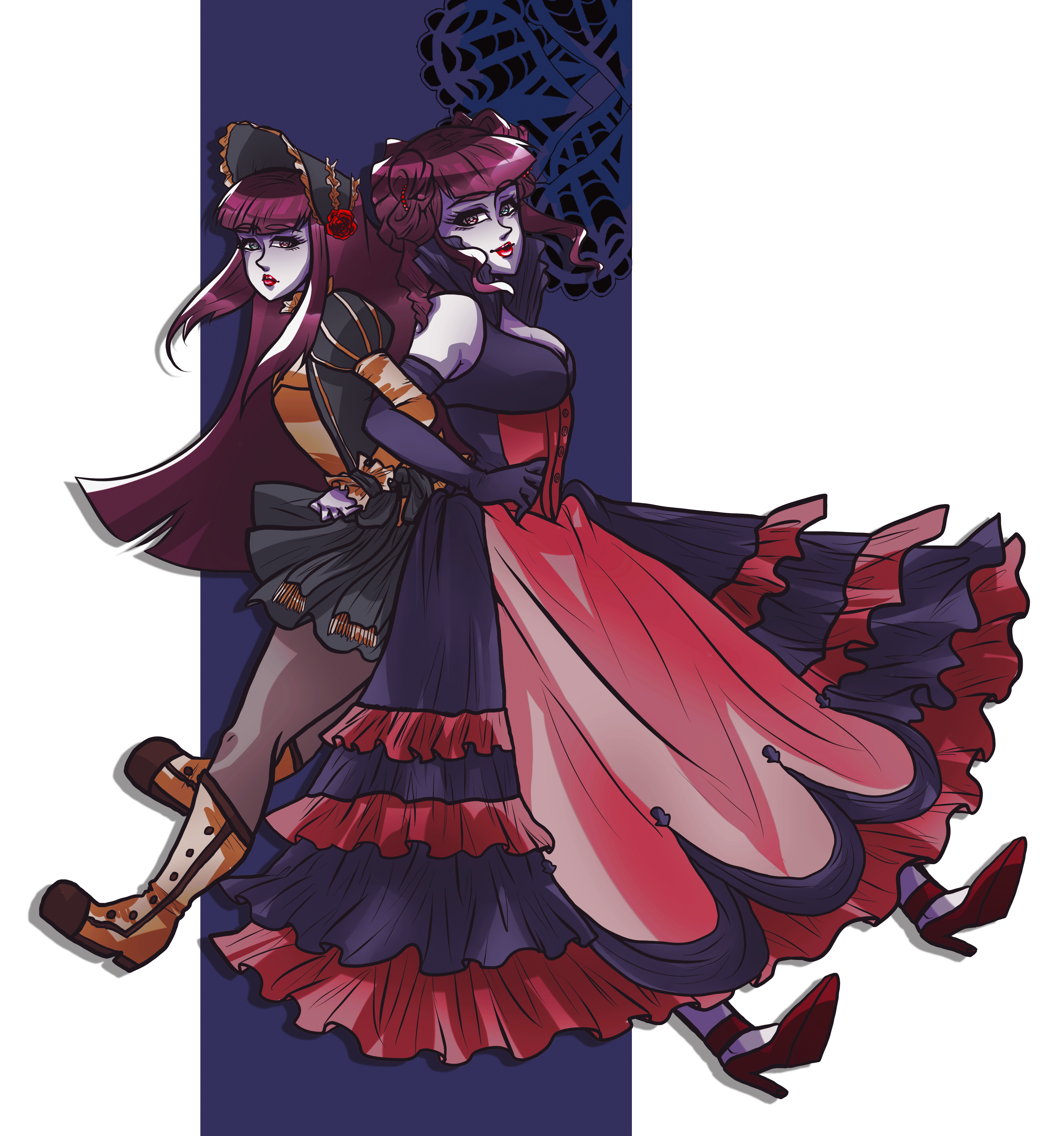 Description: A couple of women in dresses and shoes walking together in the same direction.