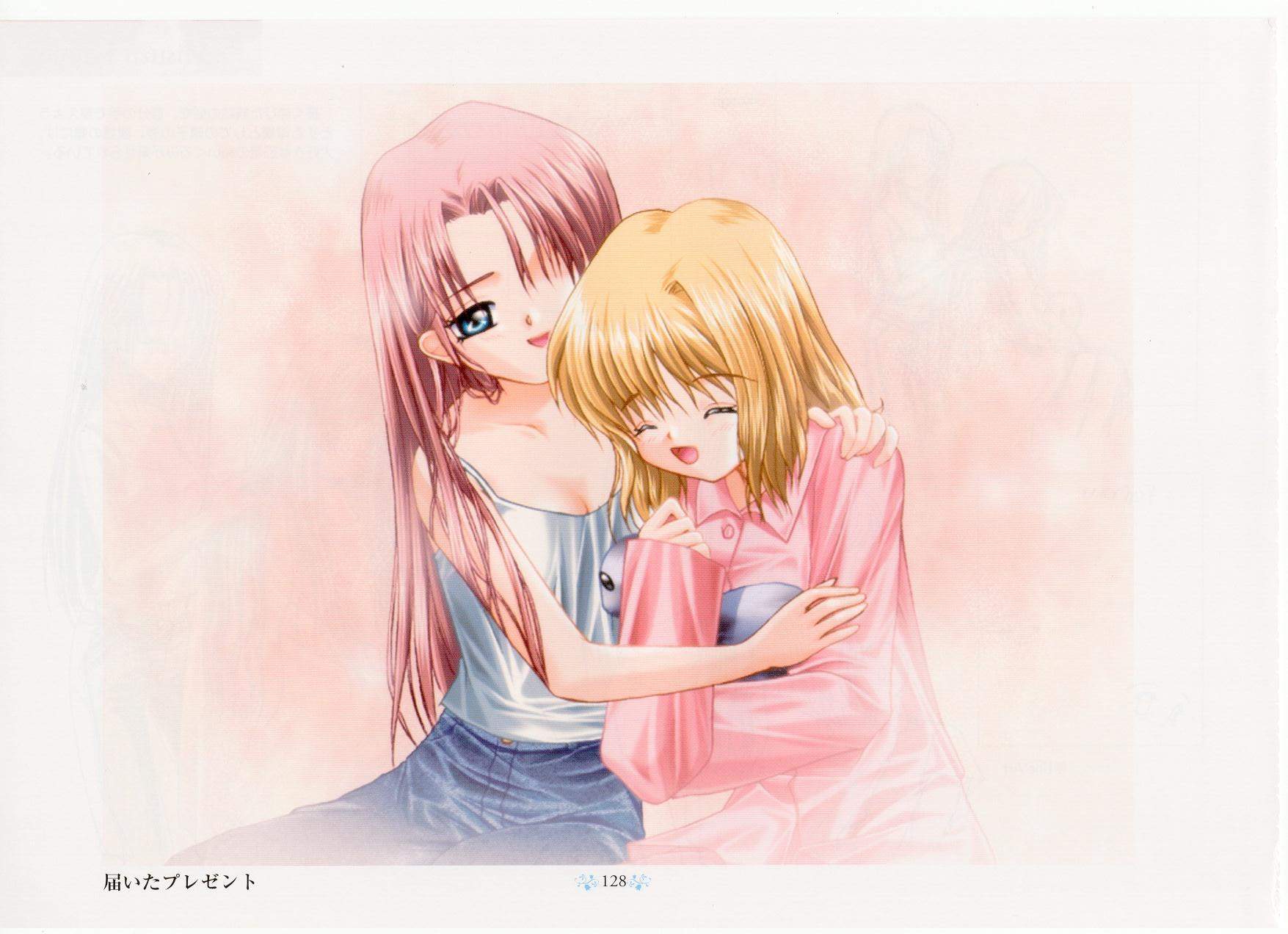 Description: A couple of women hugging each other in front of a pink background with a pink background and a pink background.