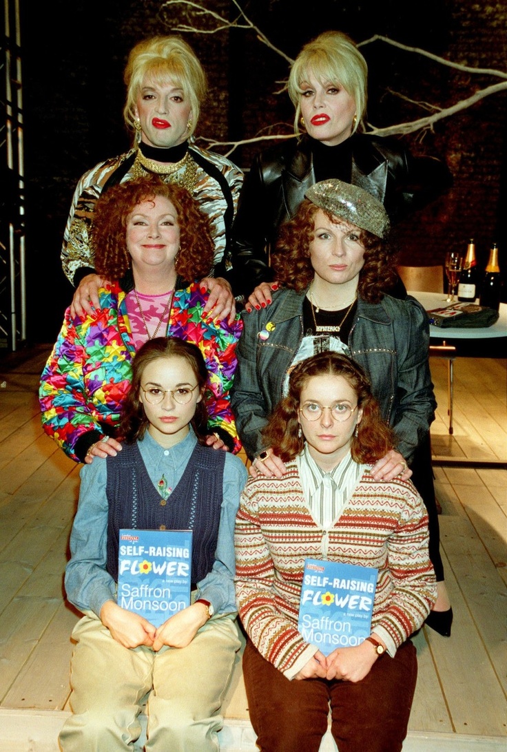 Description: A group of women sitting next to each other on a wooden floor with books on their heads and hands.