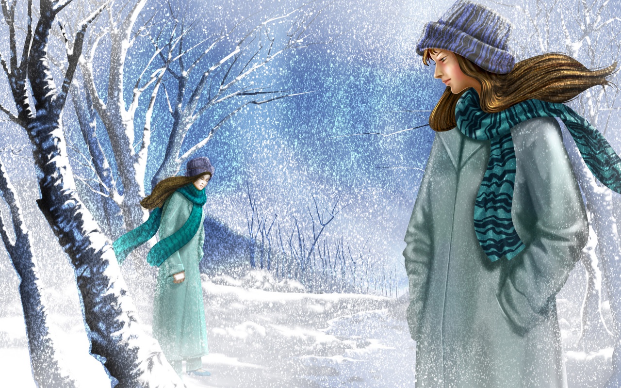Description: A painting of two women walking in the snow in winter time.