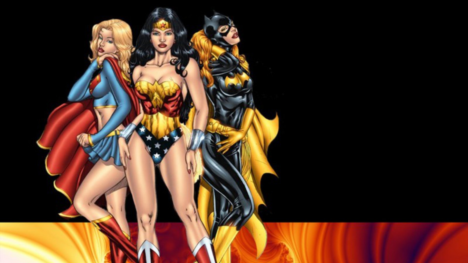 Description: Three women dressed as wonder girls standing next to each other in front of a black background with a red and yellow flame.