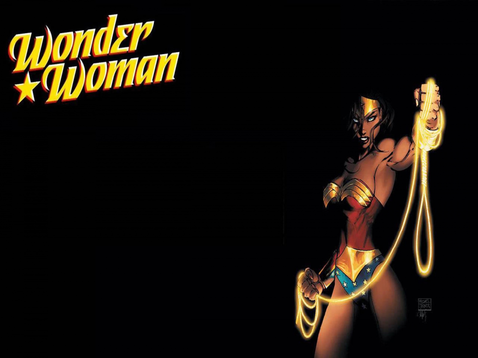 Description: A woman in a wonder wonder costume holding a whipstick in her hand and a black background with the words wonder woman.