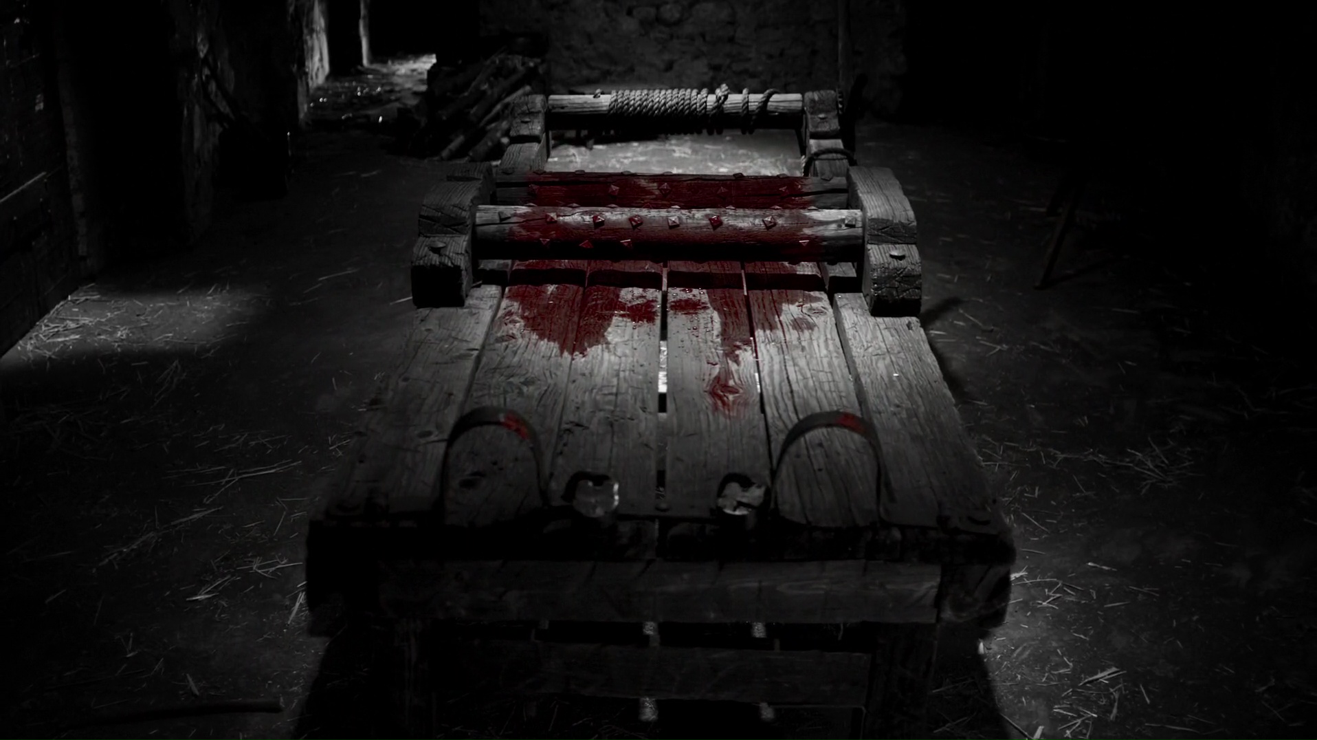 Description: A wooden bench with a blood stain on it in a dark room with a light coming through the window.