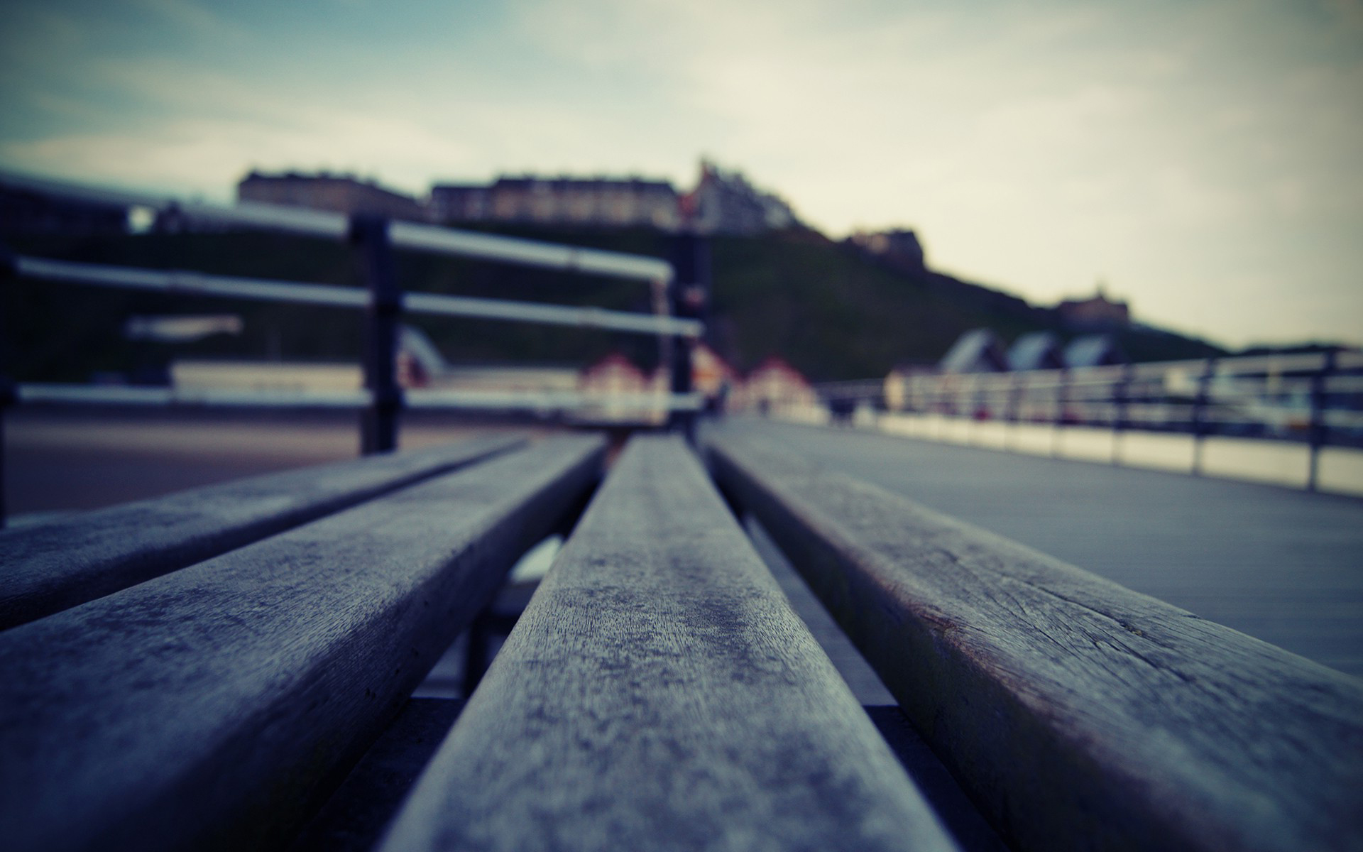 Description: A close up of a wooden bench with a city in the background at dusk or dawn or dawn or dawn.