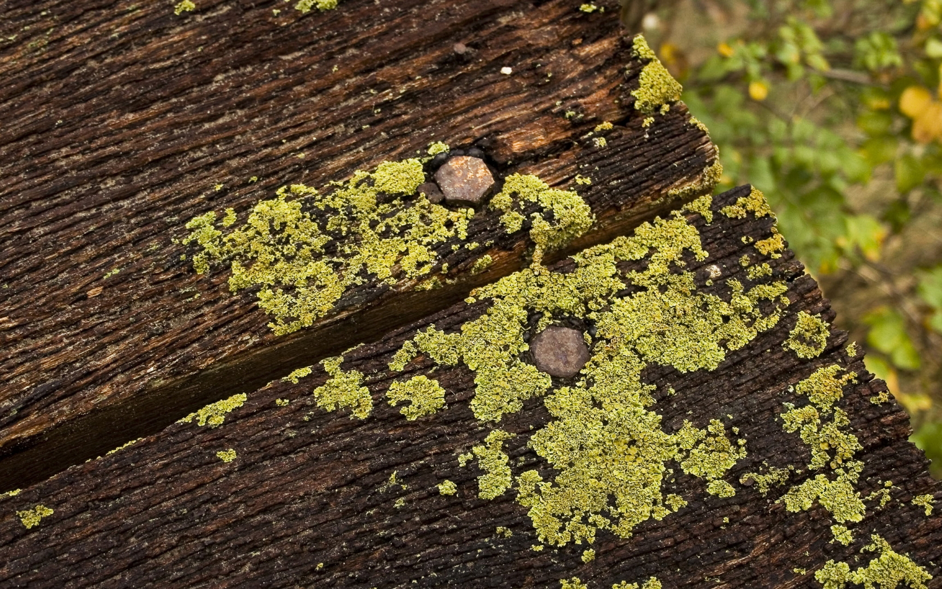 Description: A close up of a wooden bench with moss growing on it's surface and a tree in the background.