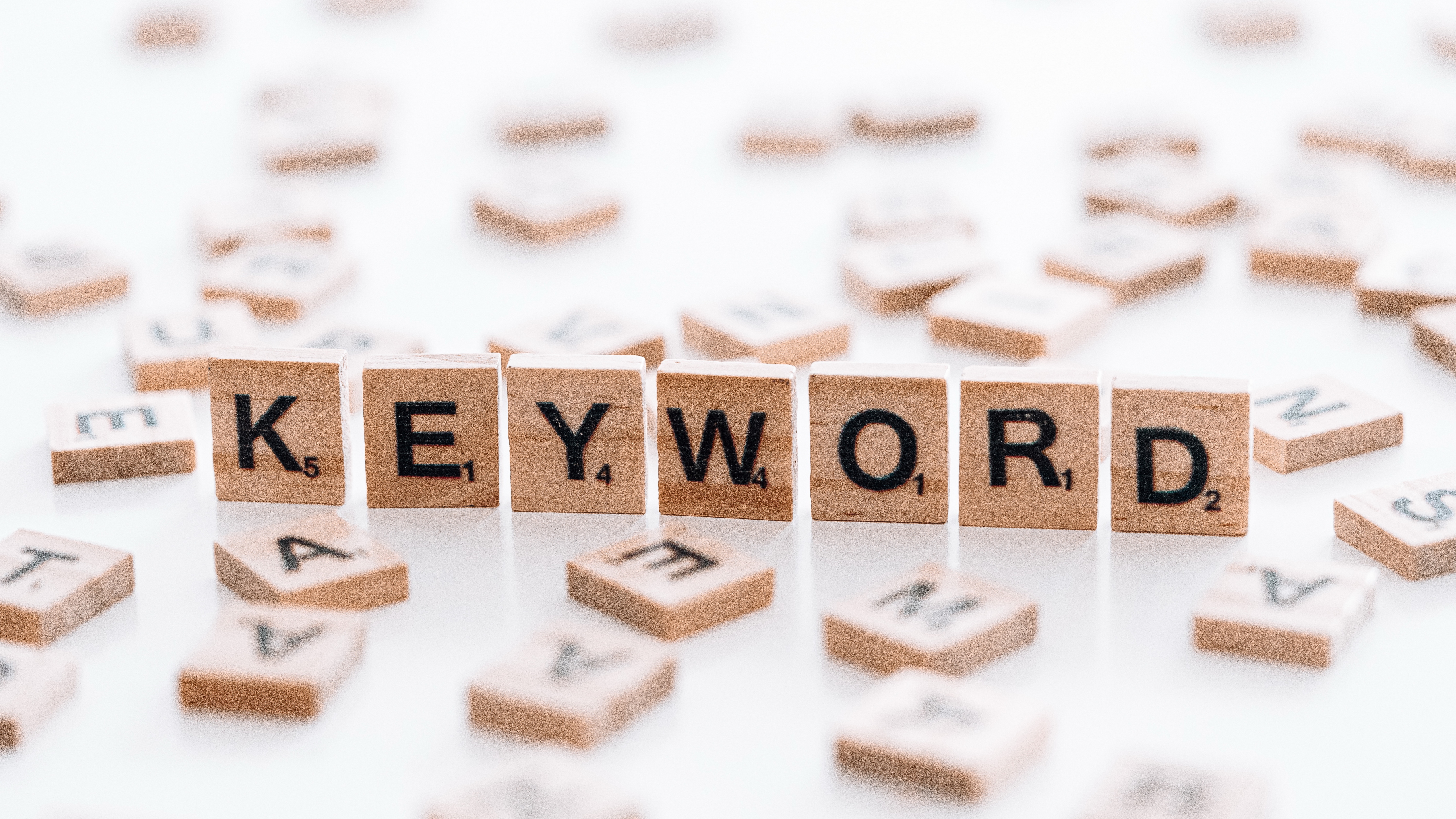 Description: A word made out of wooden blocks spelling keyword on a white surface with scattered letters and letters scattered around.