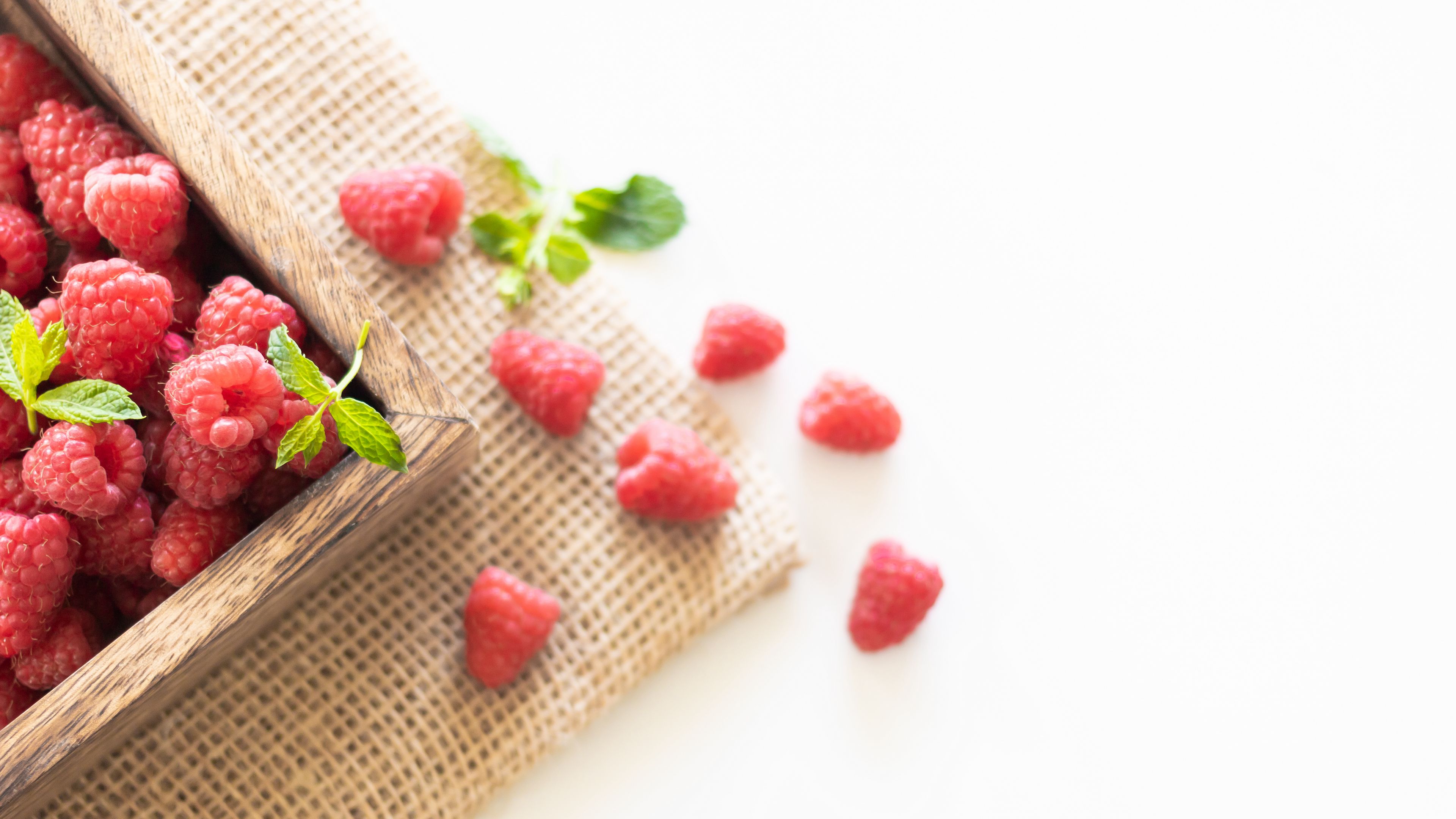 Description: A wooden box filled with raspberries on top of a white tablecloth with leaves on top of it.