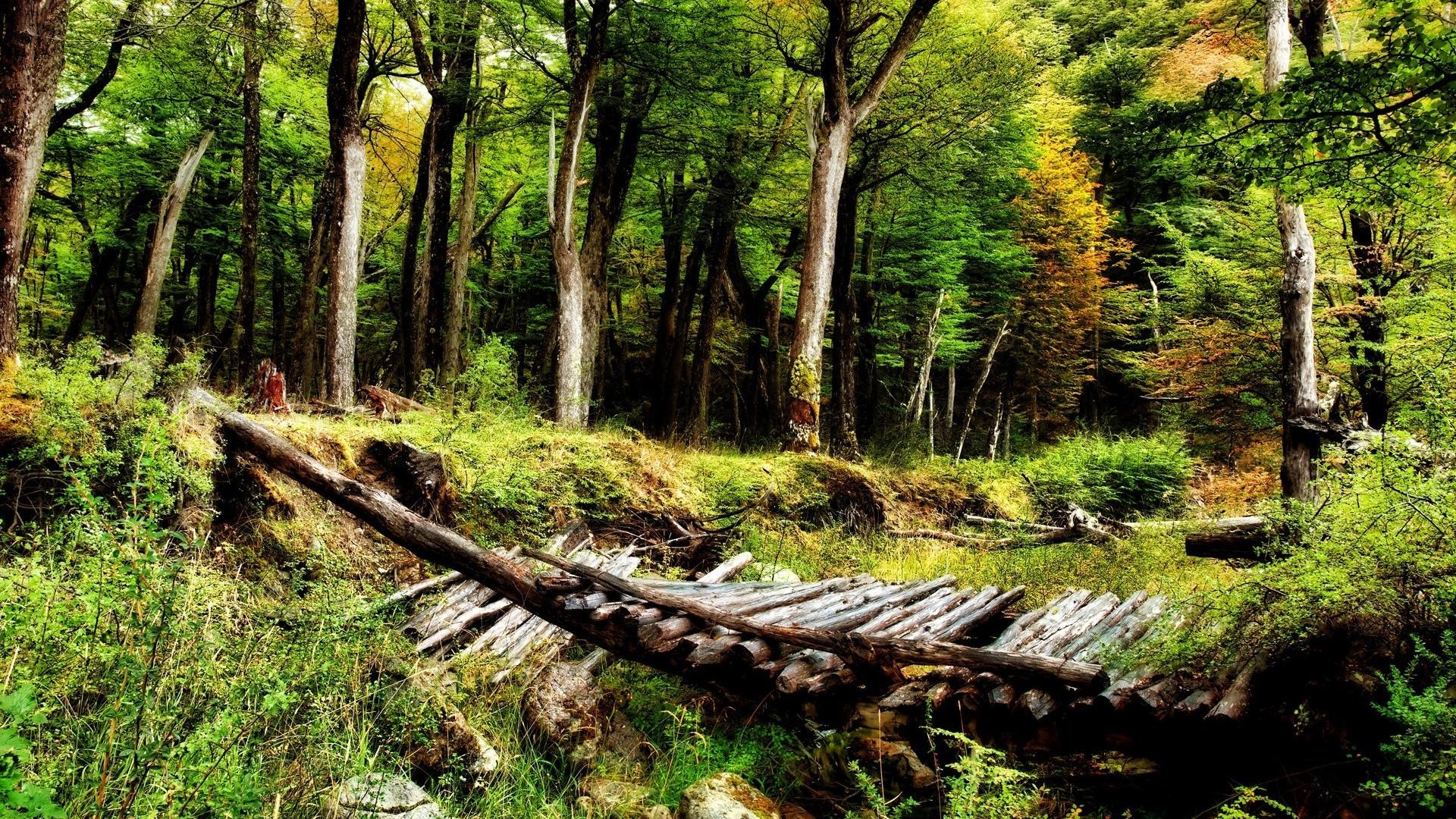 Description: A wooden bridge in a forest with lots of trees and grass on the ground and a person walking on the path.