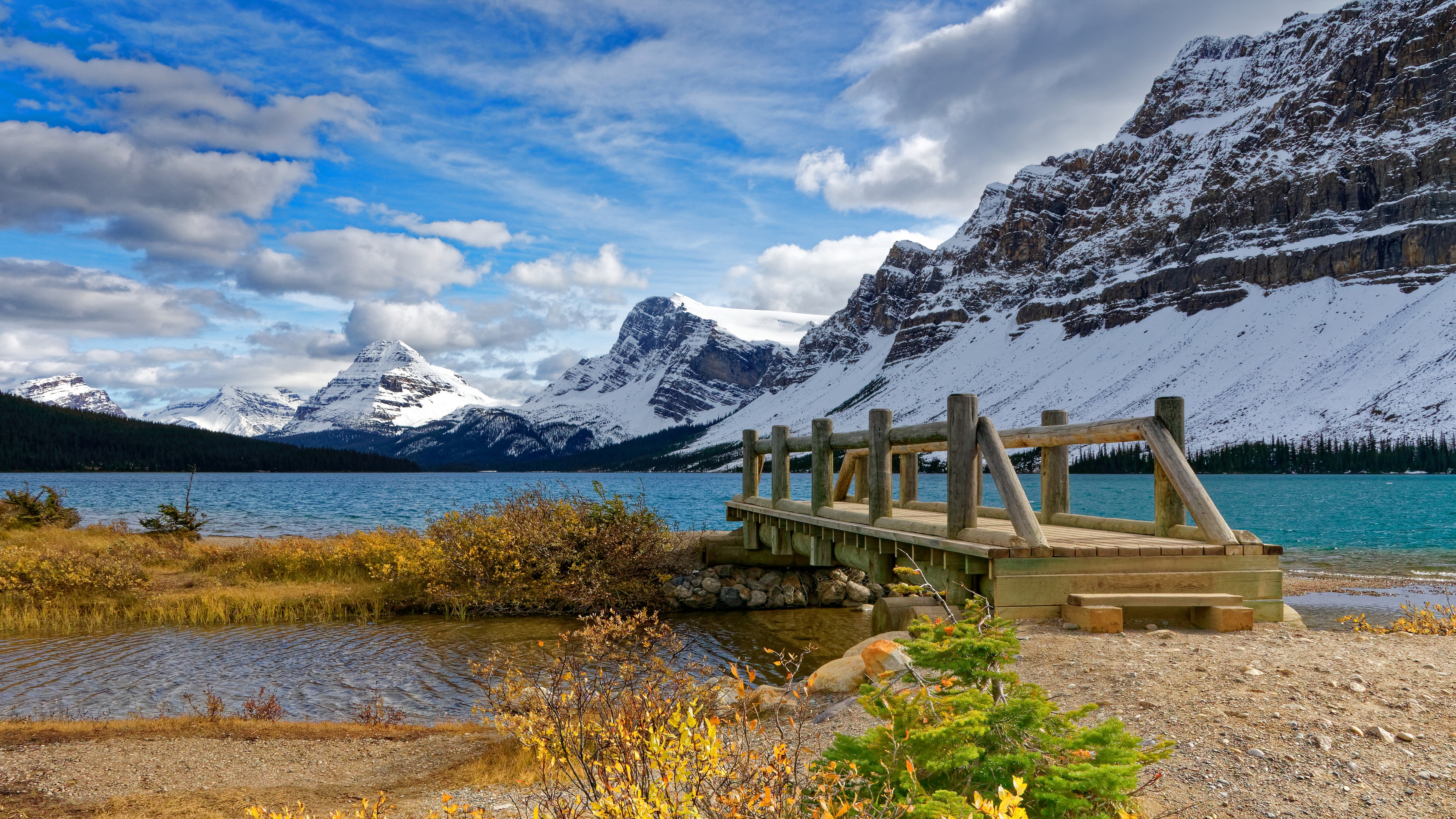 Description: A wooden bridge over a small body of water with mountains in the background and snow covered mountains in the distance.