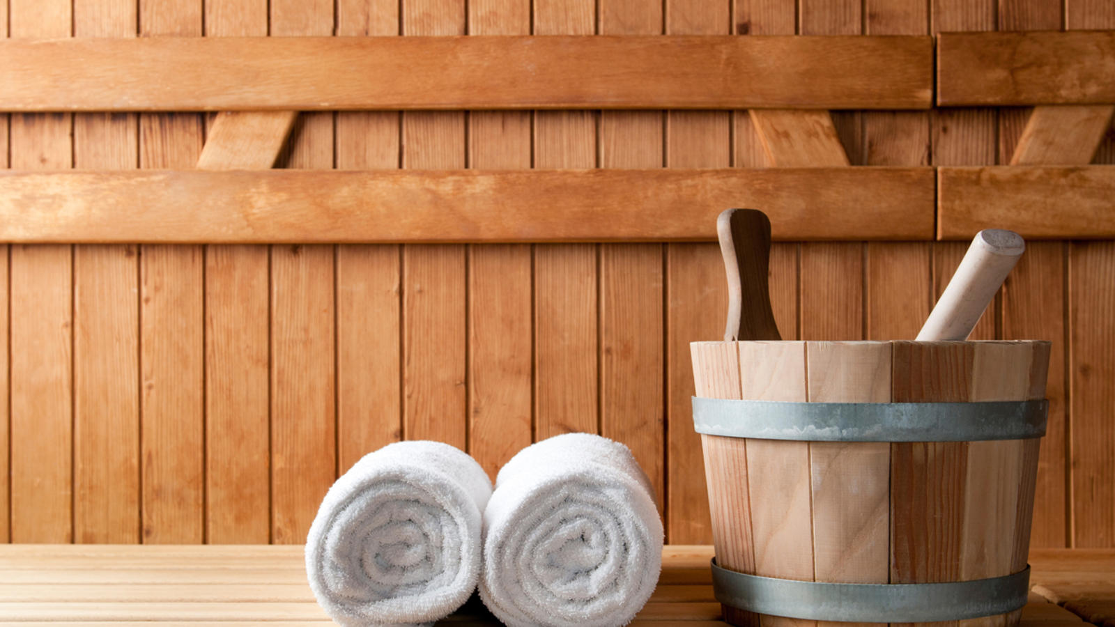 Description: A wooden bucket with two towels and a wooden spoon in it next to a wooden bucket with two towels.
