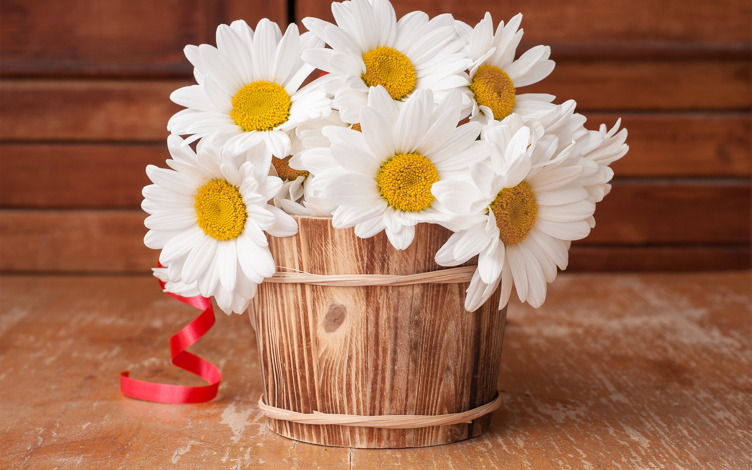 Description: A wooden bucket with white daisies and a red ribbon on a table next to a wooden wall and a wooden door.