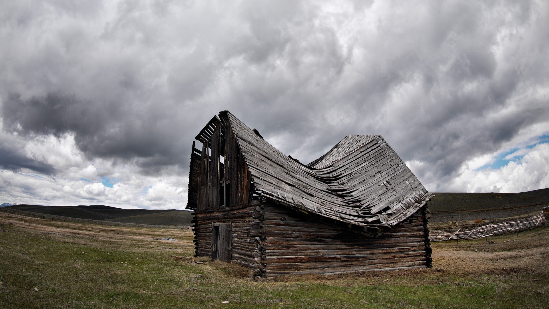 Description: A wooden building with a roof made of logs and wood in a field with a cloudy sky above it.