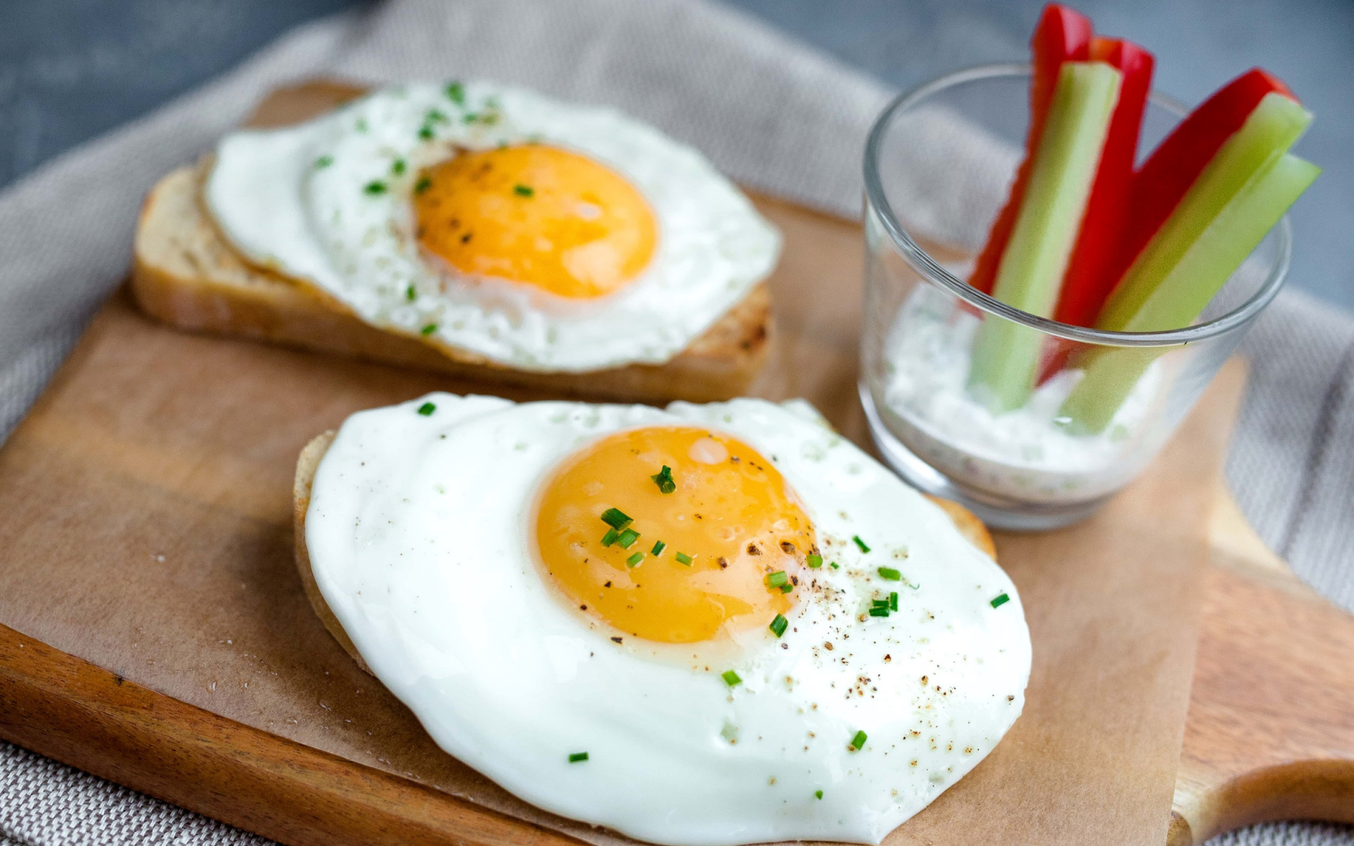 Description: A wooden cutting board topped with two eggs and a glass of pickles next to it on a table.