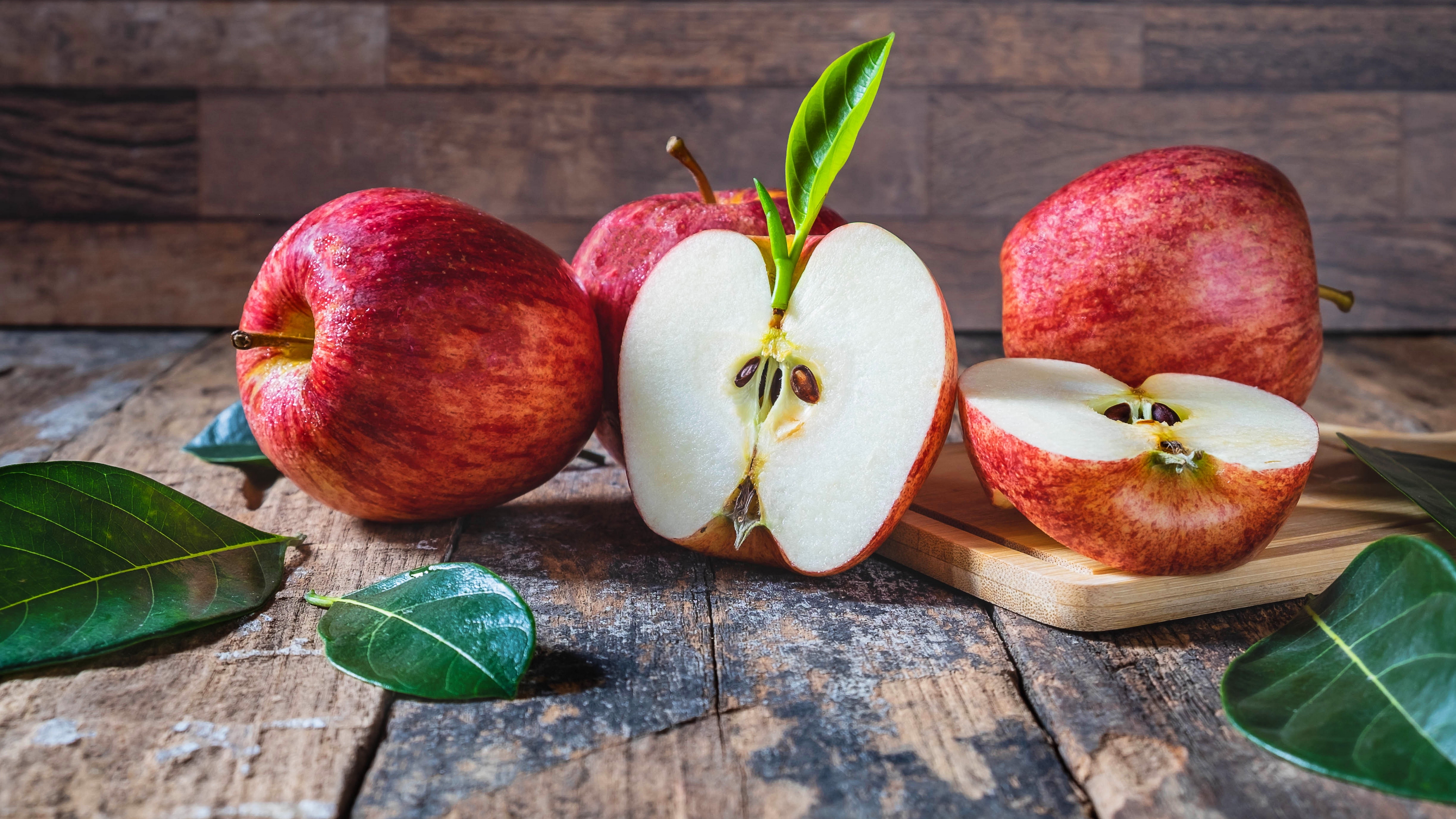 Description: A wooden cutting board topped with three red apples next to leaves and a knife on a wooden table with a wooden background.