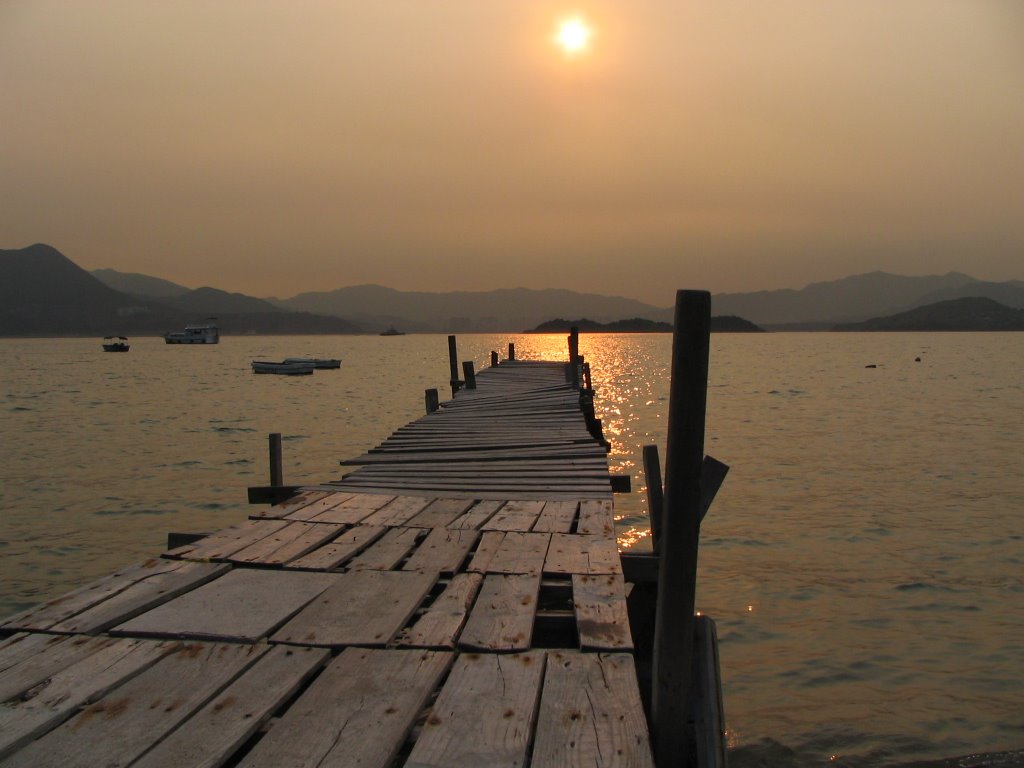 Description: A wooden dock with a boat in the water and a sunset in the background with mountains in the distance.