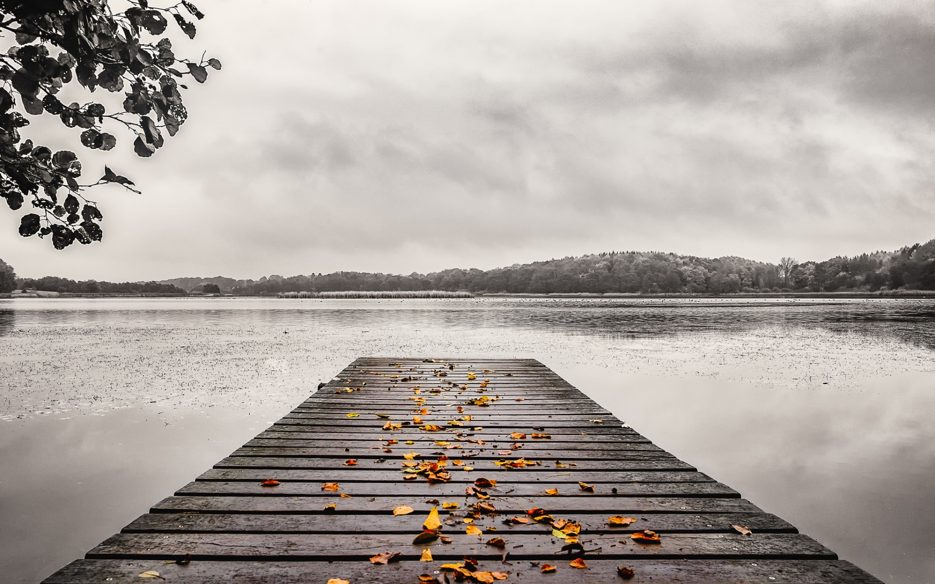 Description: A wooden dock with leaves on it in the water and a cloudy sky above it.