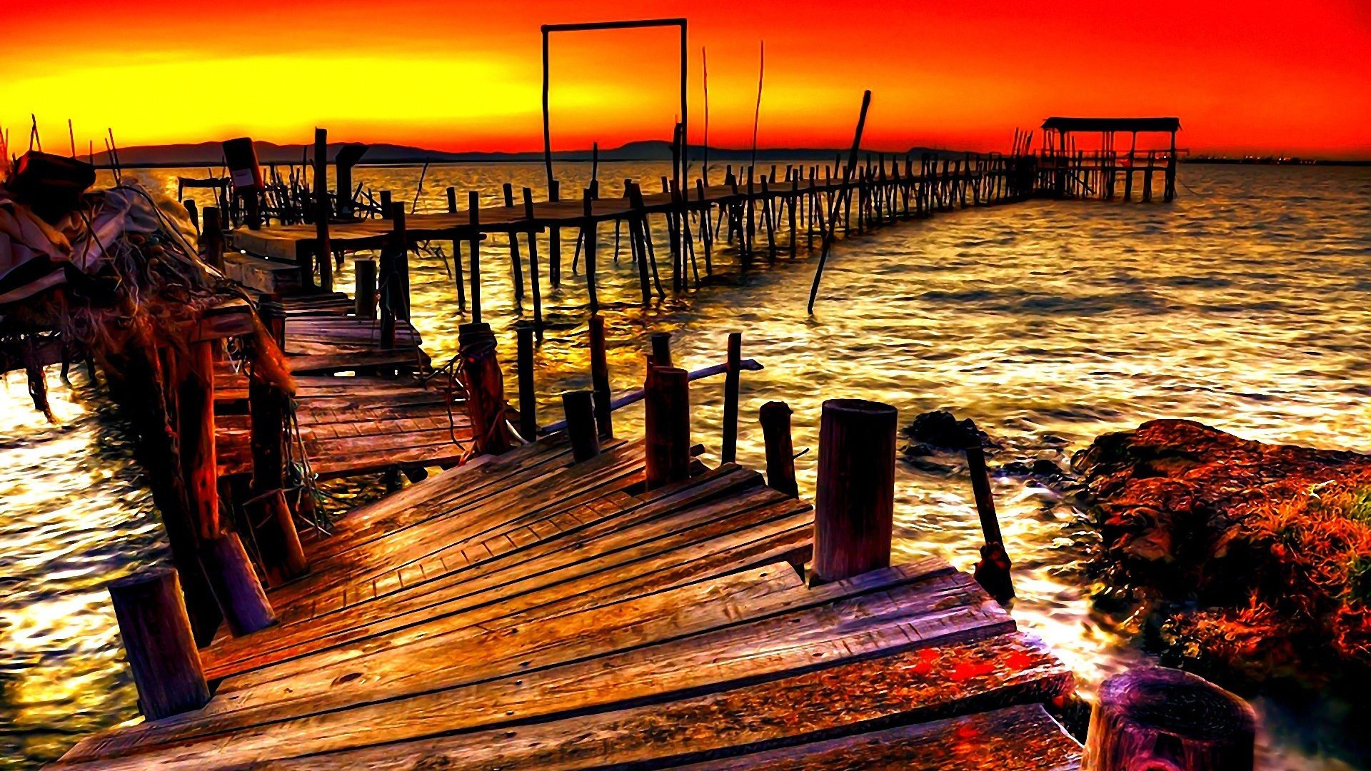 Description: A wooden dock sitting on top of a body of water at sunset with a red sky in the background.