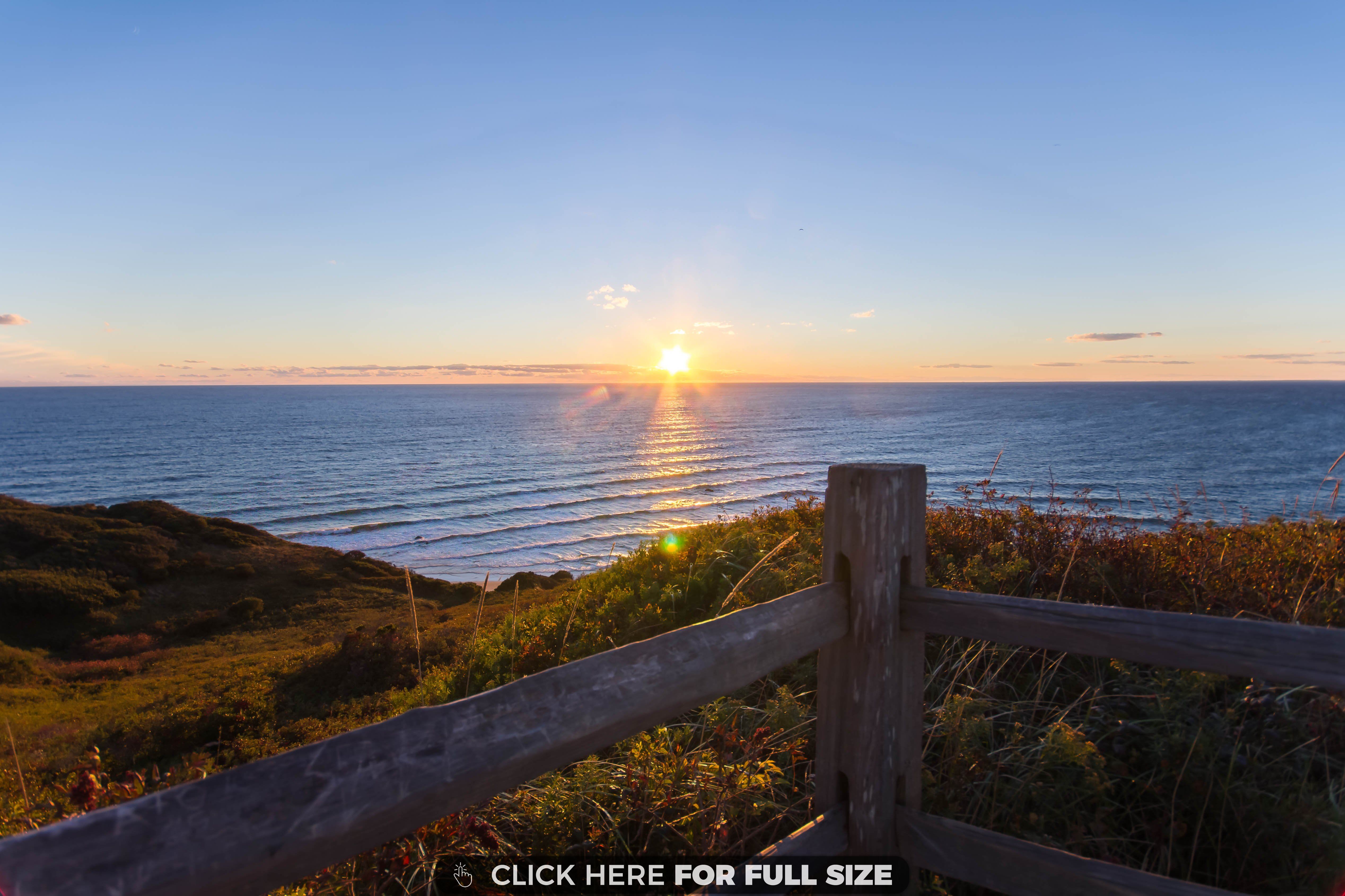 Description: A wooden fence on a hill overlooking the ocean at sunset or sunrise time with the sun setting over the ocean.