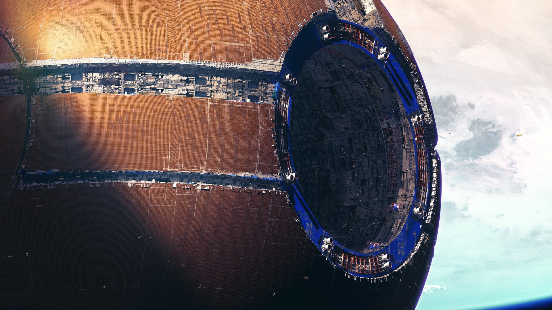 Description: A large wooden object with a blue strip on it's side and a sky background with a blue strip on it.