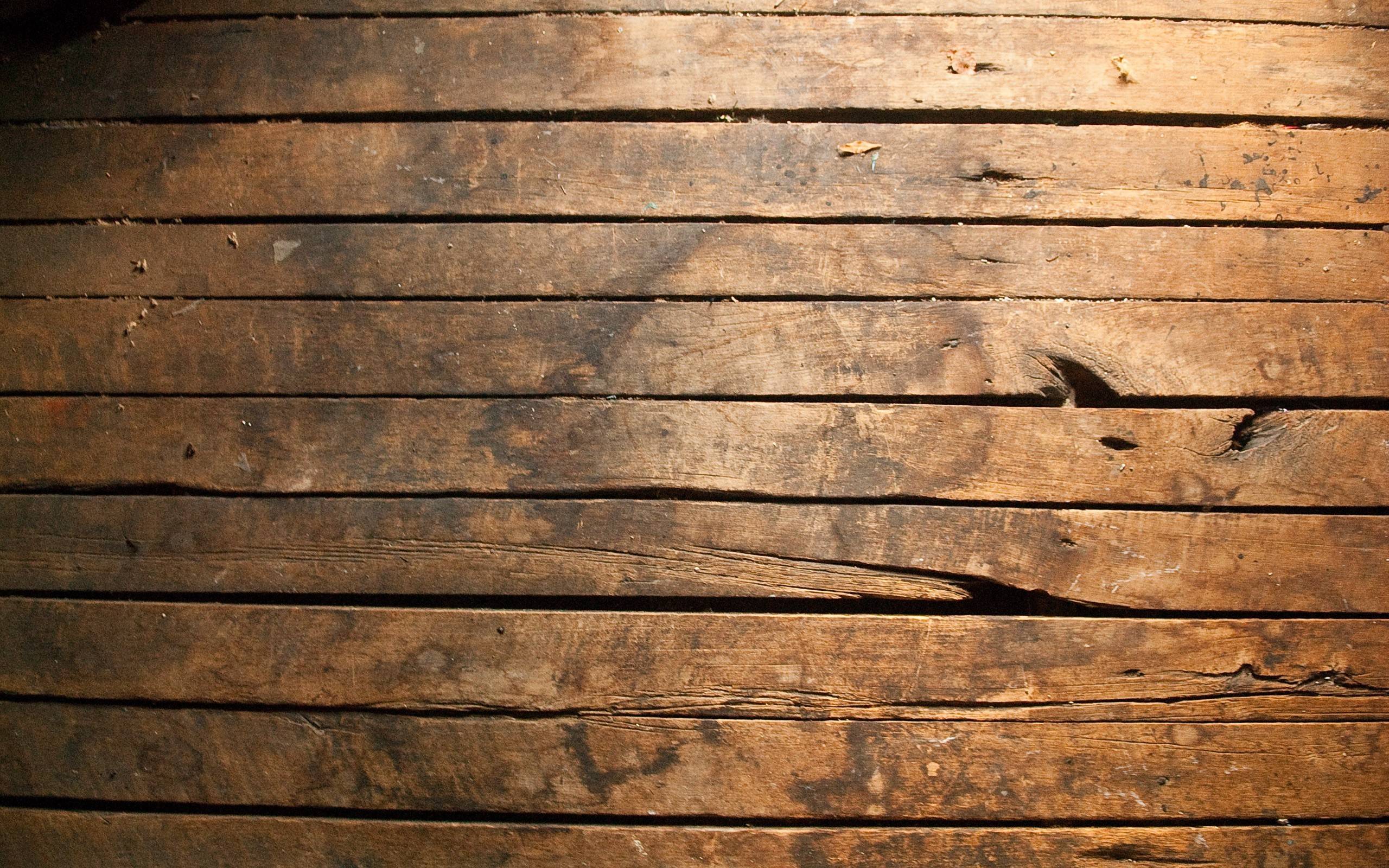 Description: A close up of a wooden plank with a brown stain on it's surface and a black spot on the bottom of the plank.