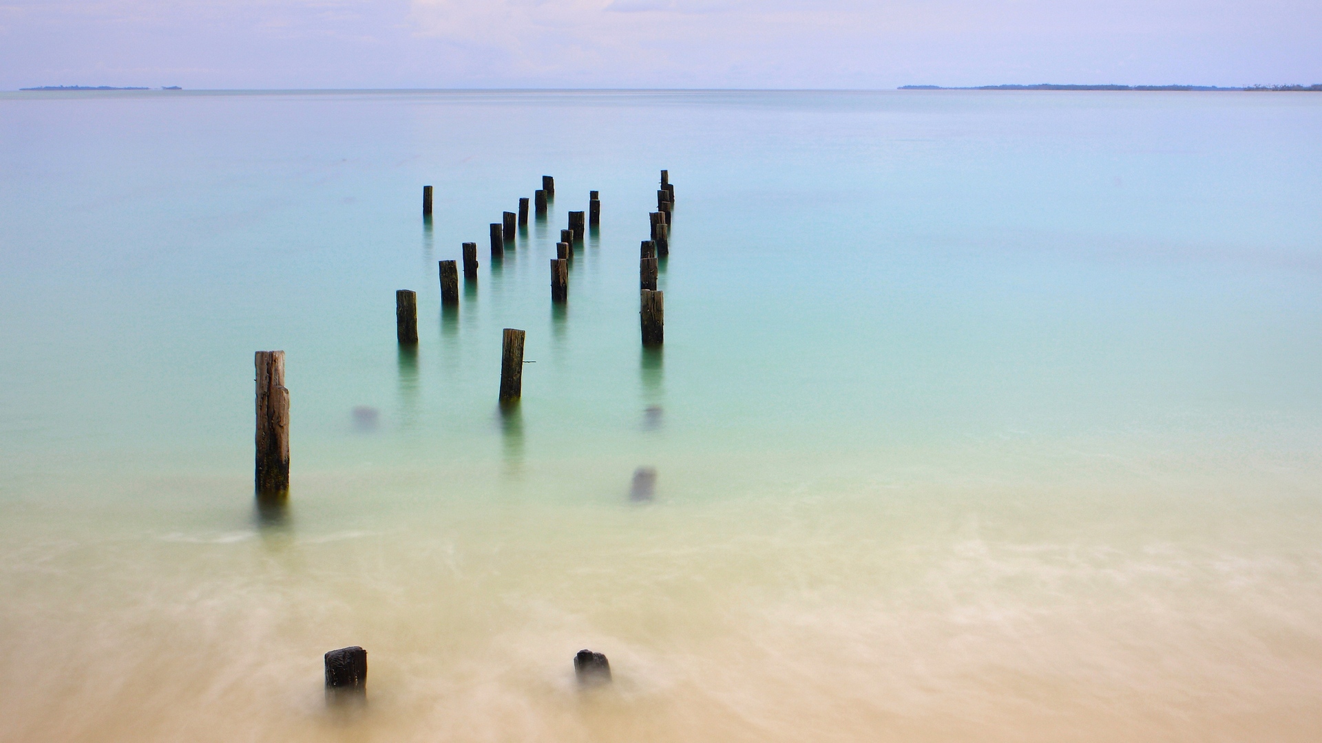 Description: A long row of wooden posts sticking out of the ocean water on a beach with a sky background and a few clouds.