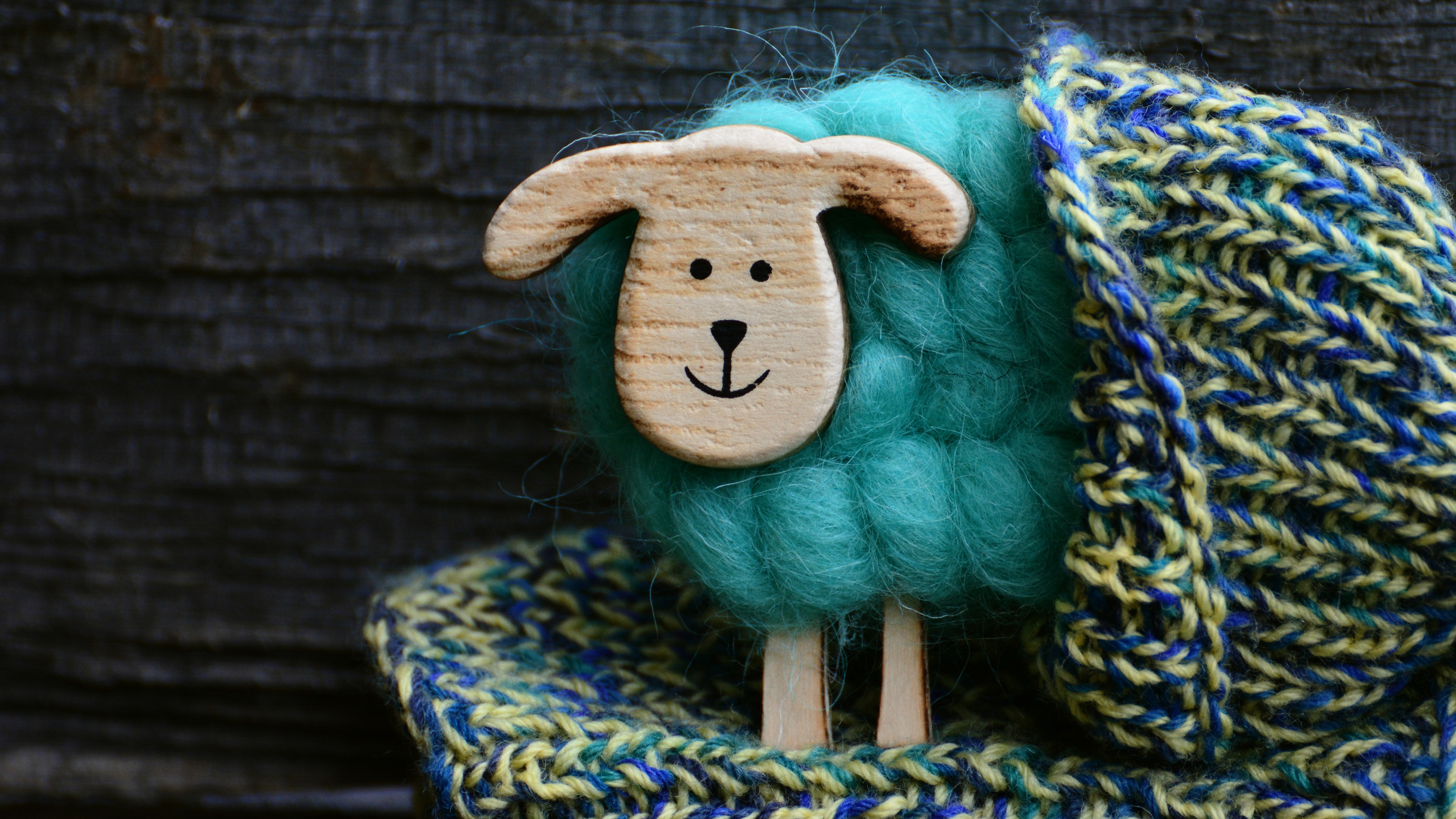 Description: A wooden sheep is sitting on a blanket on a wooden surface with a blue and yellow blanket around it.