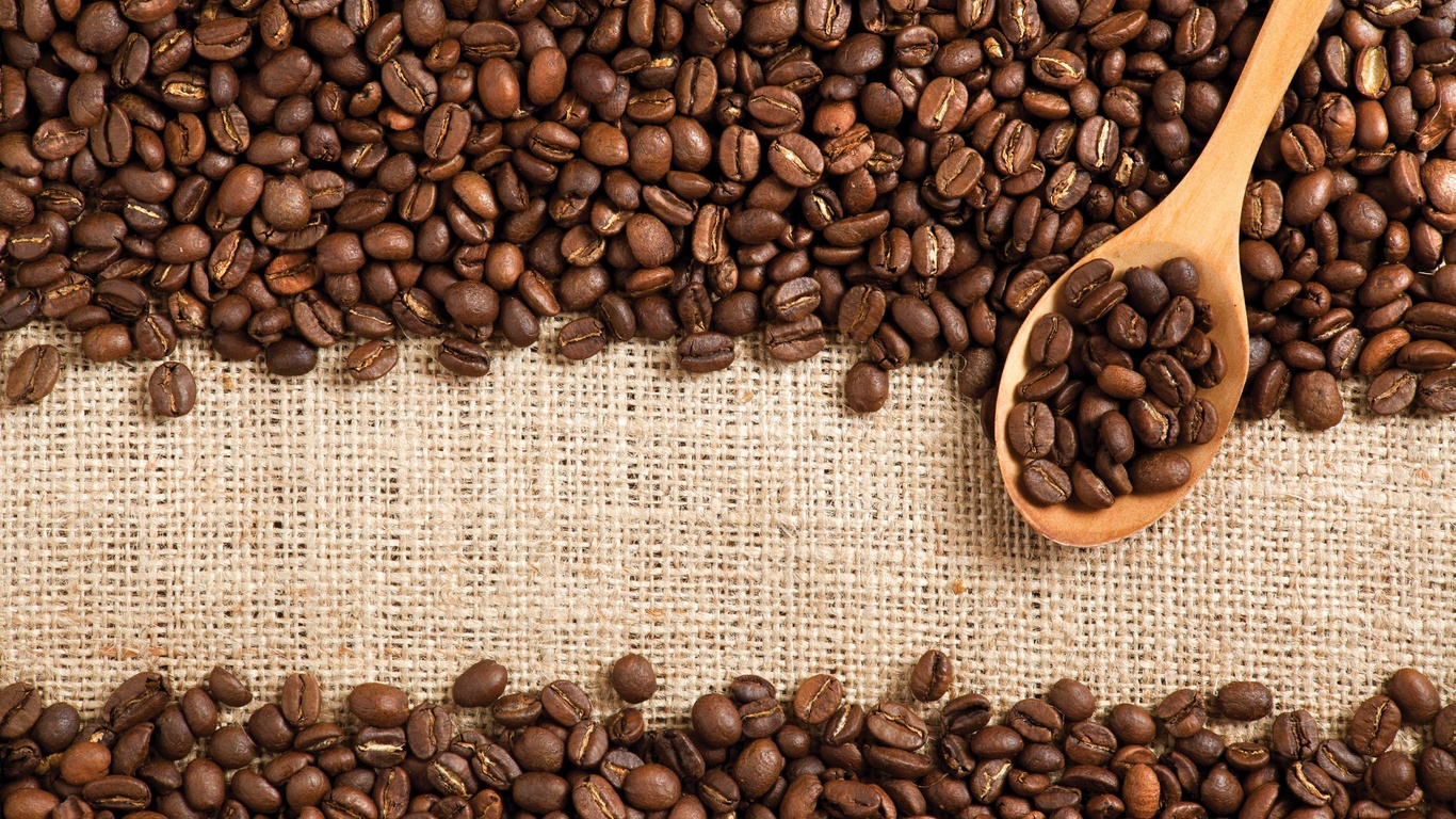 Description: A wooden spoon sitting on top of a pile of coffee beans on a burlap surface with a sack of burlap.