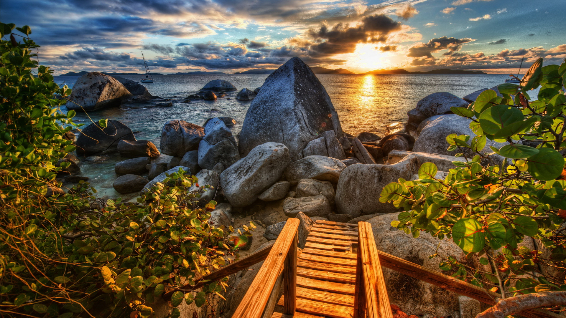 Description: A wooden staircase leading to a beach with a sunset in the background and a rocky shoreline with a rock formation.