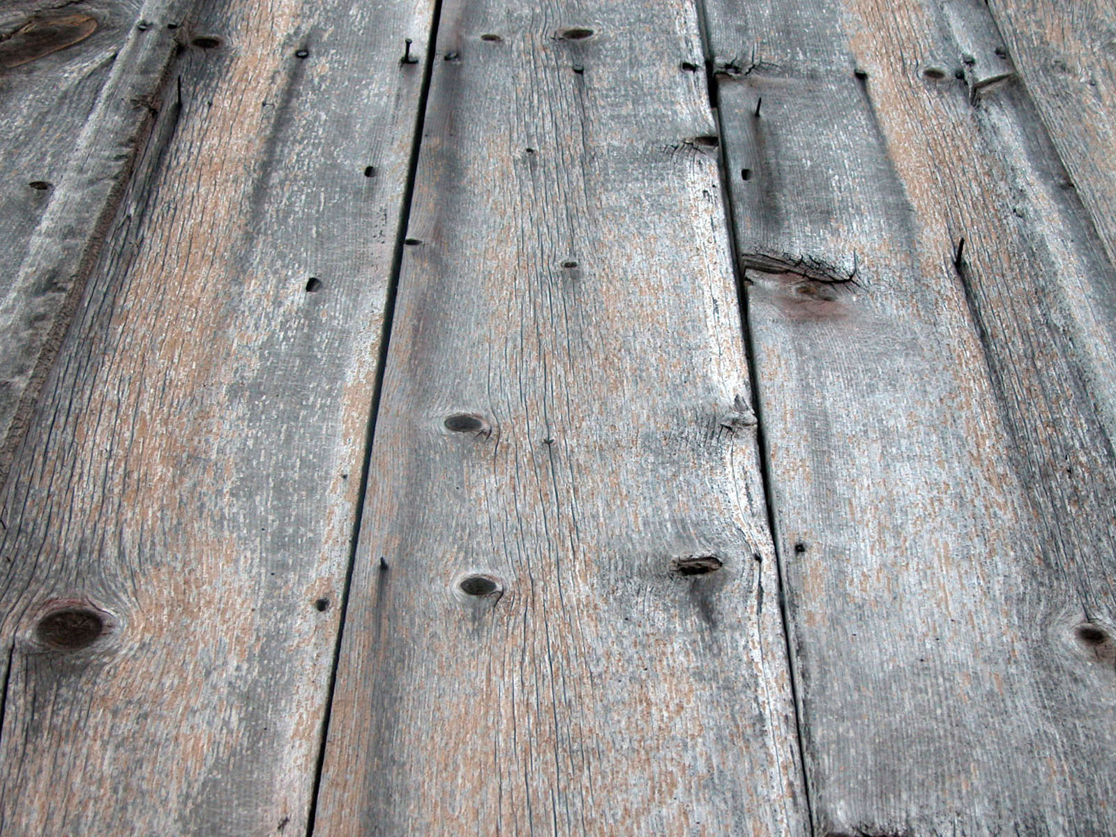Description: A close up of a wooden surface with holes in it and a bird on the side of the wood.
