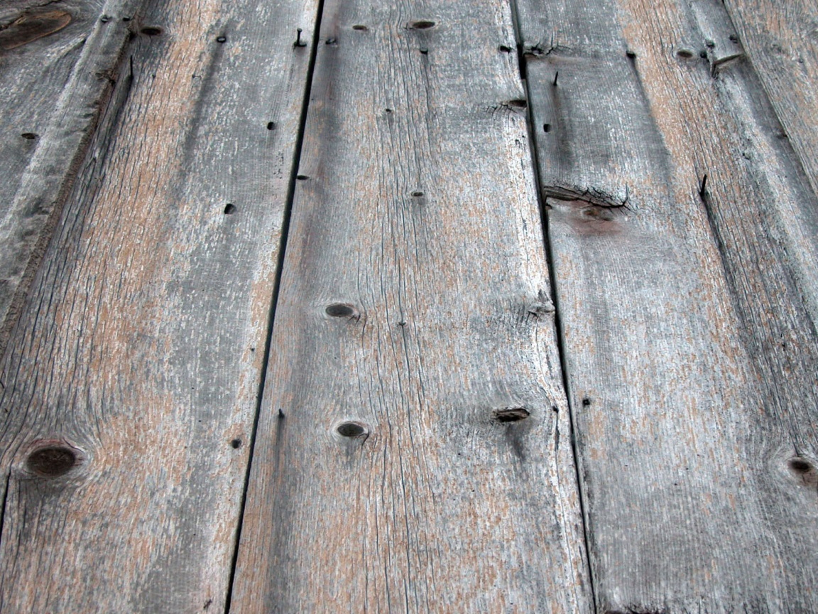 Description: A close up of a wooden surface with holes in it and a bird on the side of the wood.