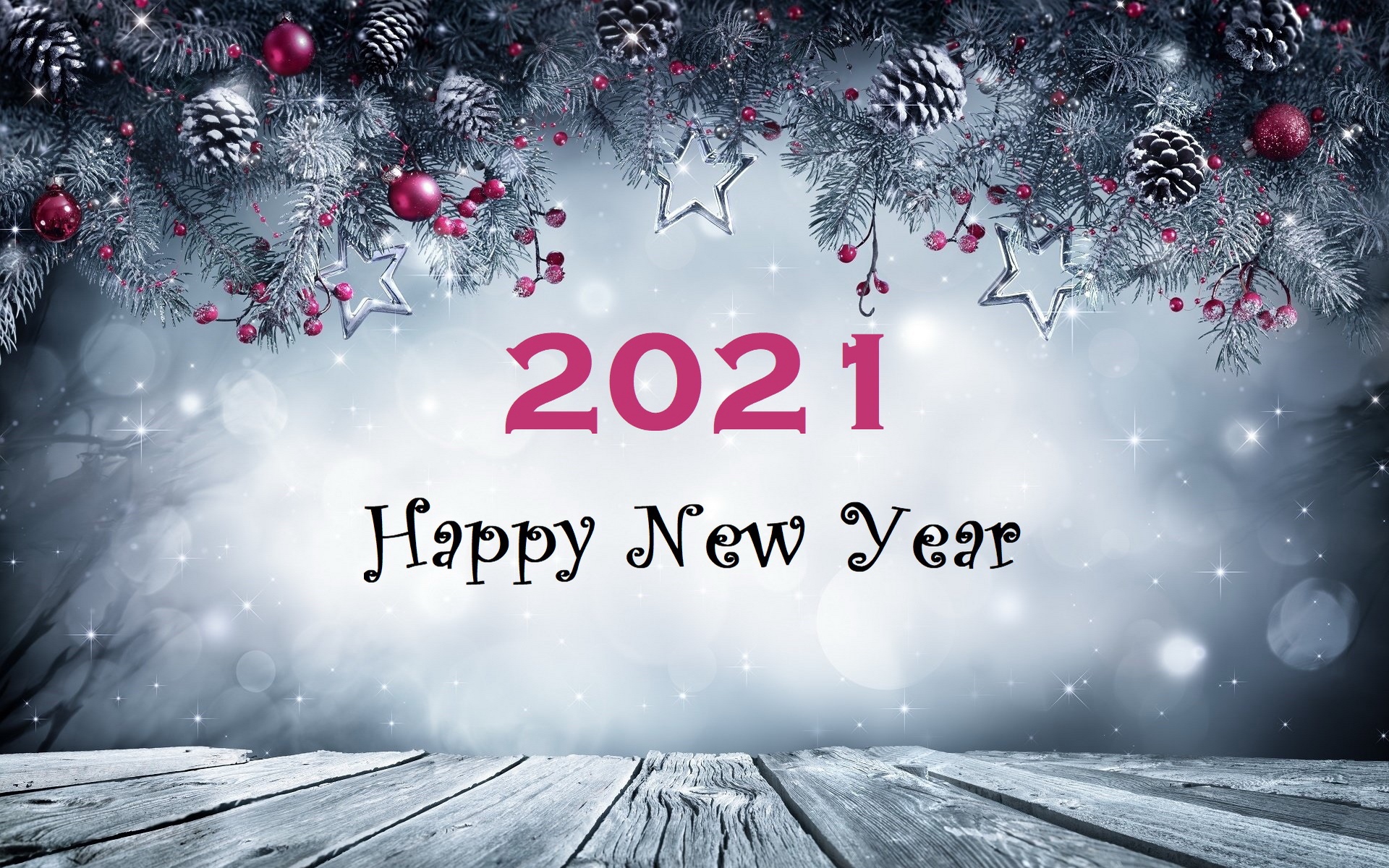 Description: A wooden table topped with a christmas tree and a happy new year message on it's side with a wooden floor.