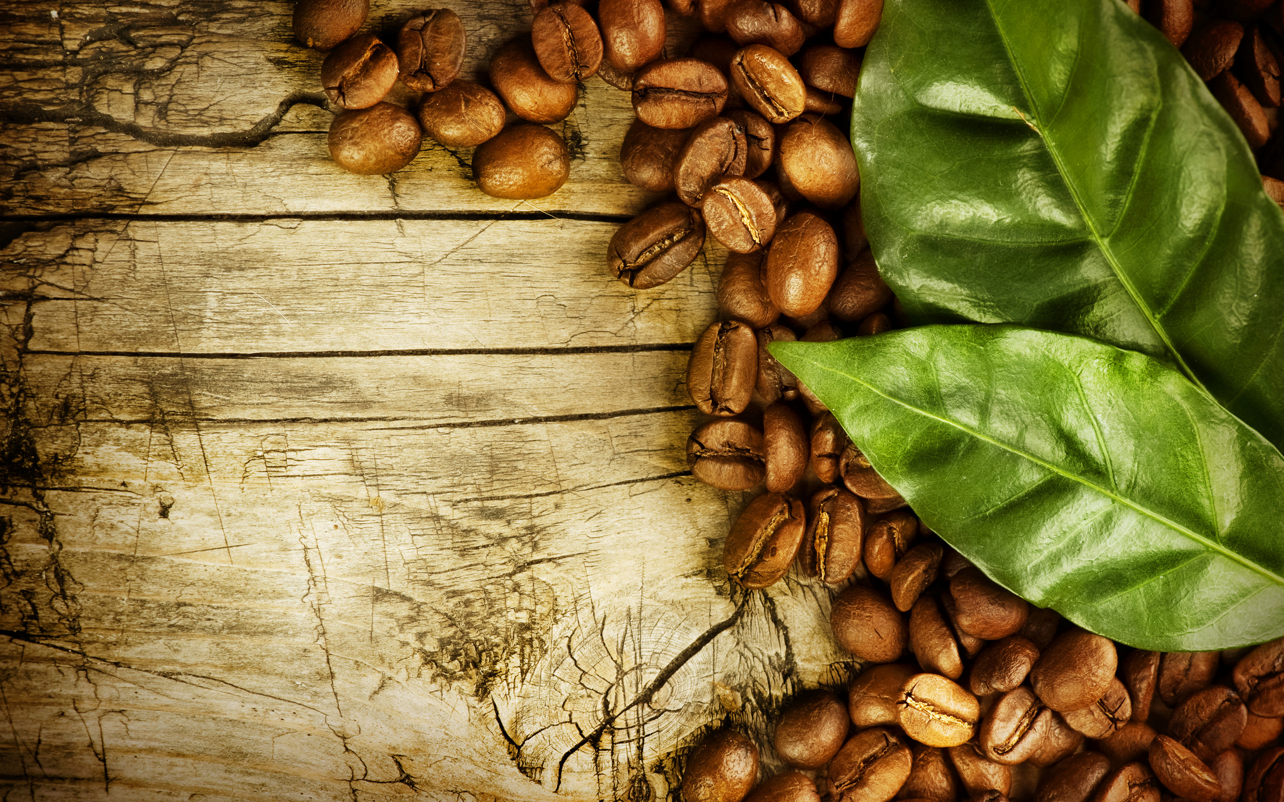 Description: A wooden table topped with lots of coffee beans and a leaf on top of it.