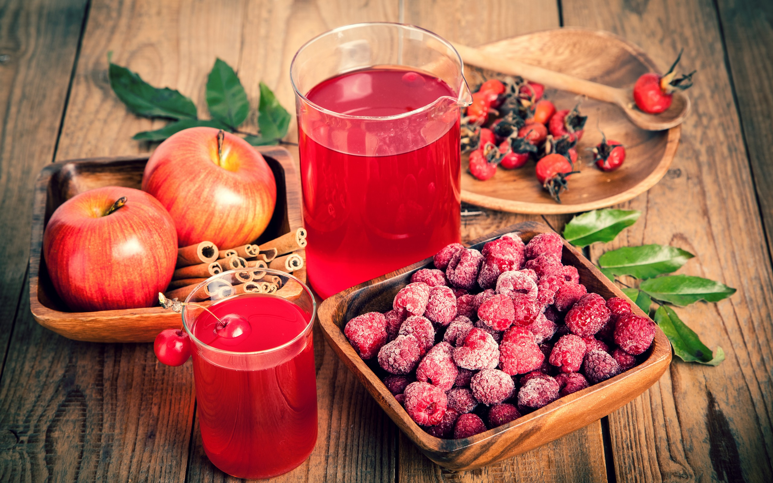 Description: A wooden table topped with a bowl of fruit and a cup of juice next to a tray of berries.
