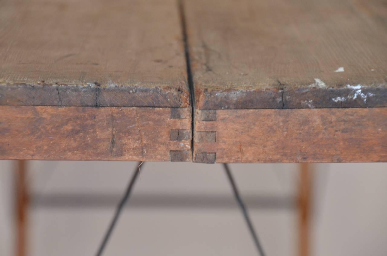 Description: A close up of a wooden table with a metal base and a piece of wood on top of it.