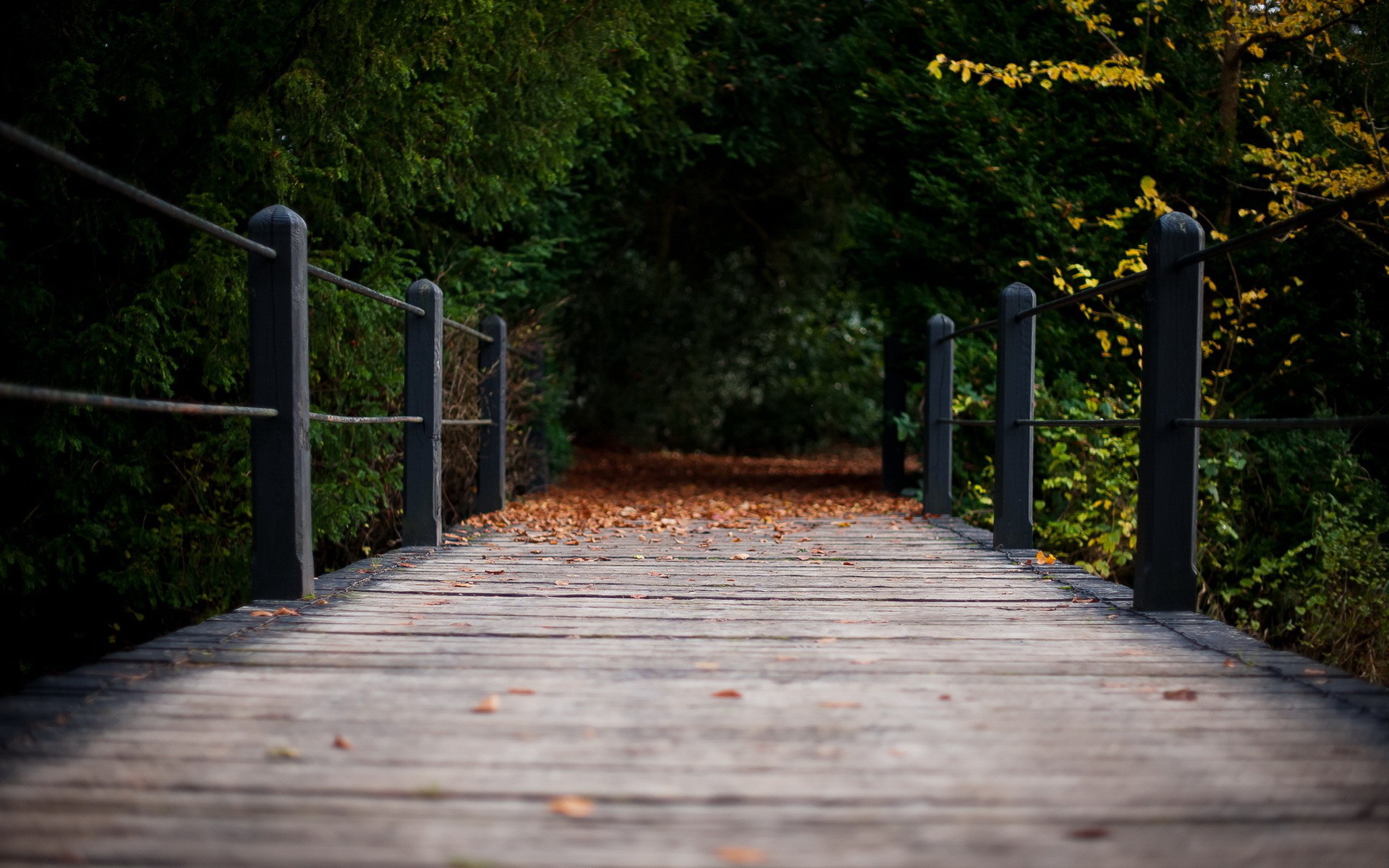 Description: A wooden walkway with metal railings leading to a forest area with trees and leaves on the ground and a path leading to the top.