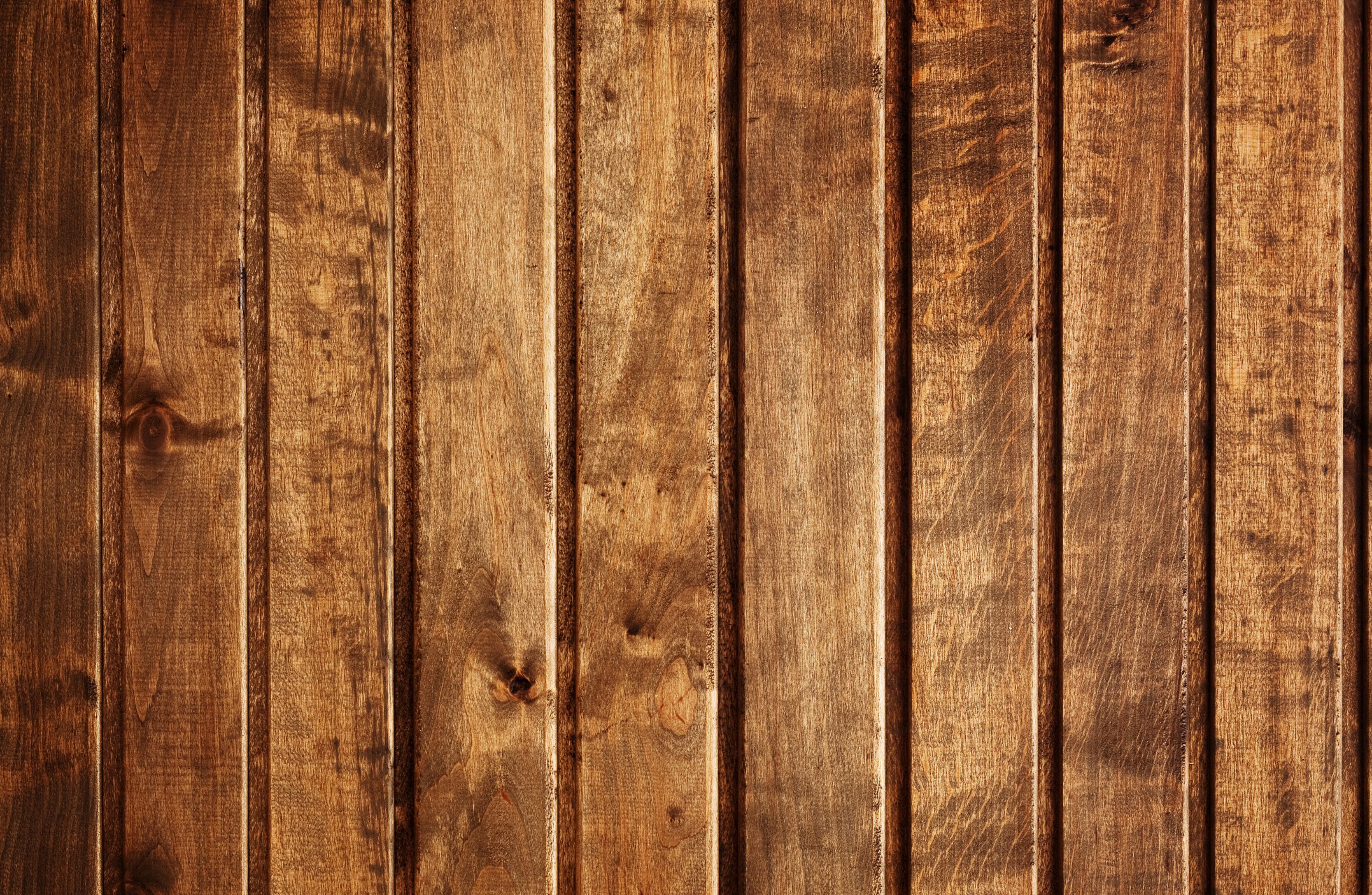 Description: A wooden wall with a brown wood grain pattern on it's surface and a black and white clock on the wall.