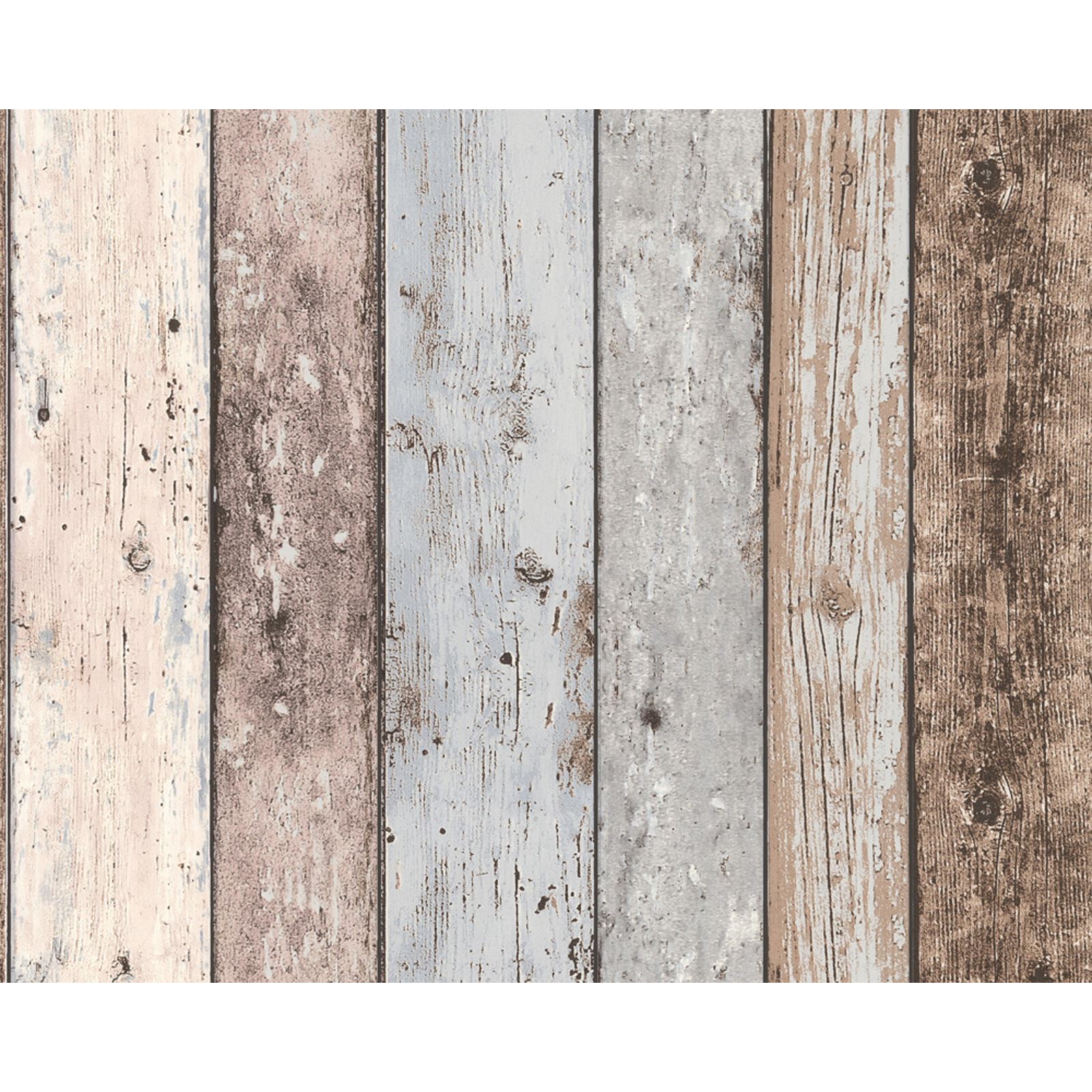 Description: A wooden wall with different colors and textures of wood planks on it.