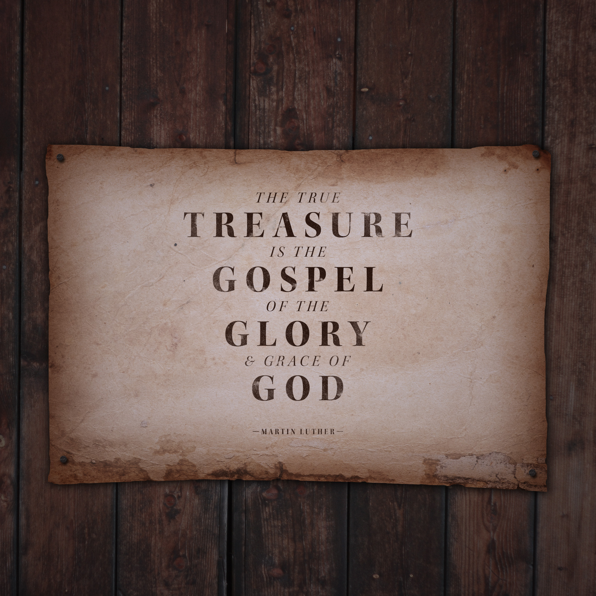 Description: A sign on a wooden wall that says the true treasure is the gospel of the glory and grace of god.