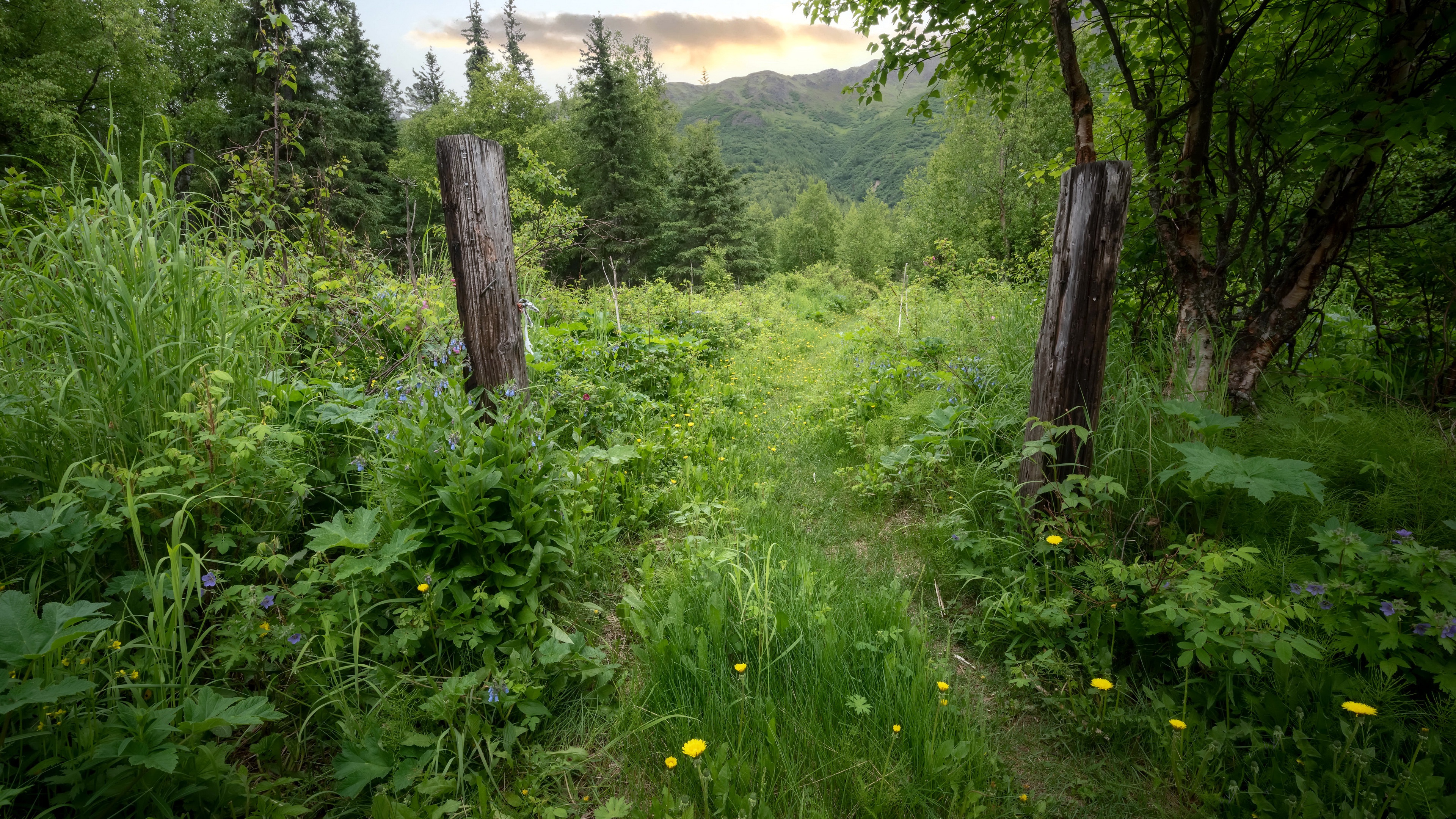 Description: A trail in the woods with tall grass and wildflowers on the side of it and a mountain in the distance.