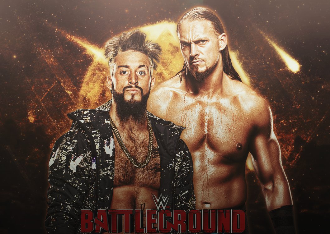 Description: Two men in wrestling gear standing next to each other with a background of gold and red stars behind them.
