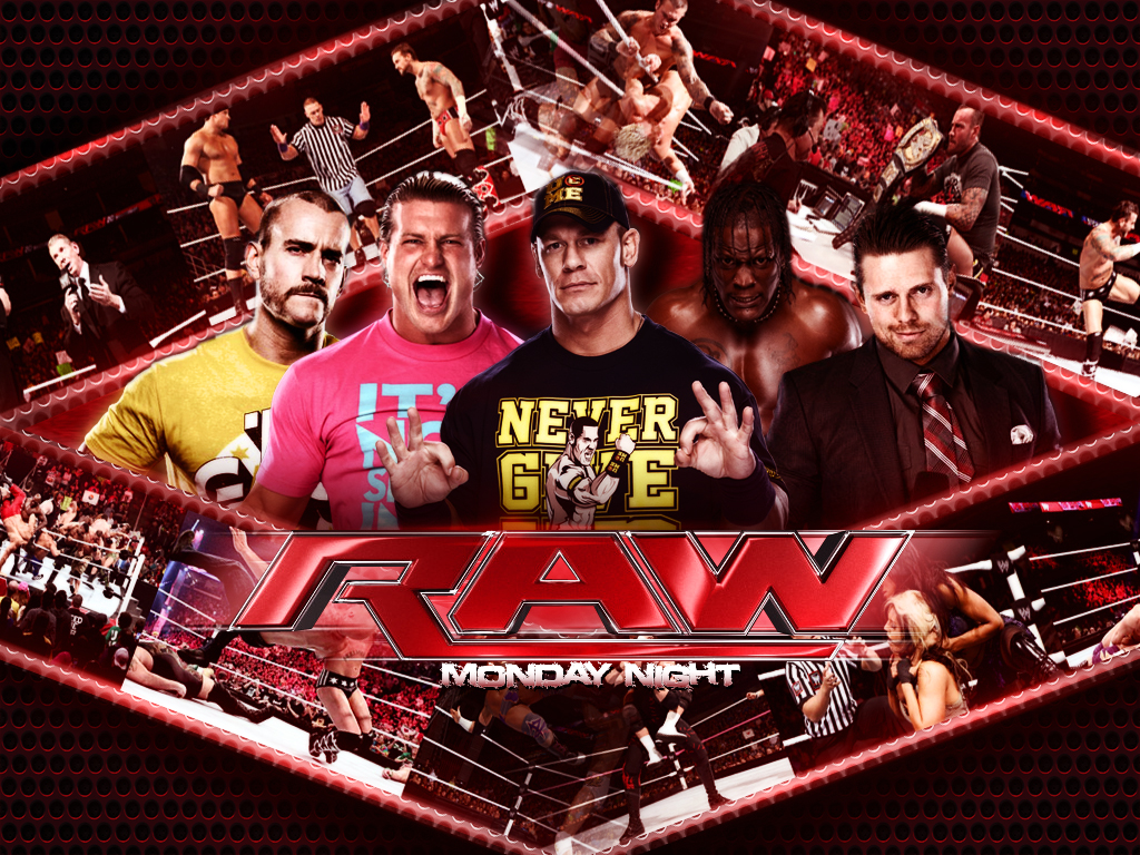 Description: A group of wrestlers standing in front of a red background with the words raw monday night on it's side.