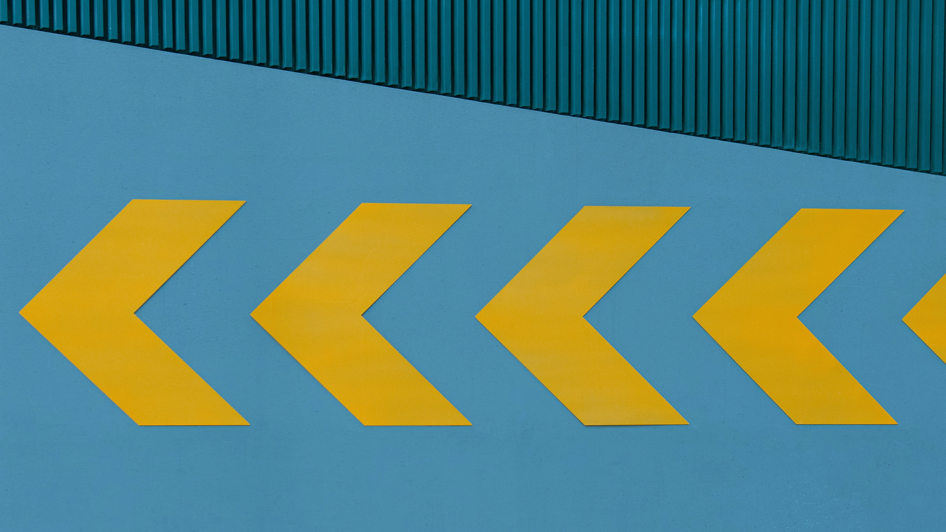 Description: A yellow arrow pointing in opposite directions on a blue wall with a green wall behind it and a blue wall behind it.