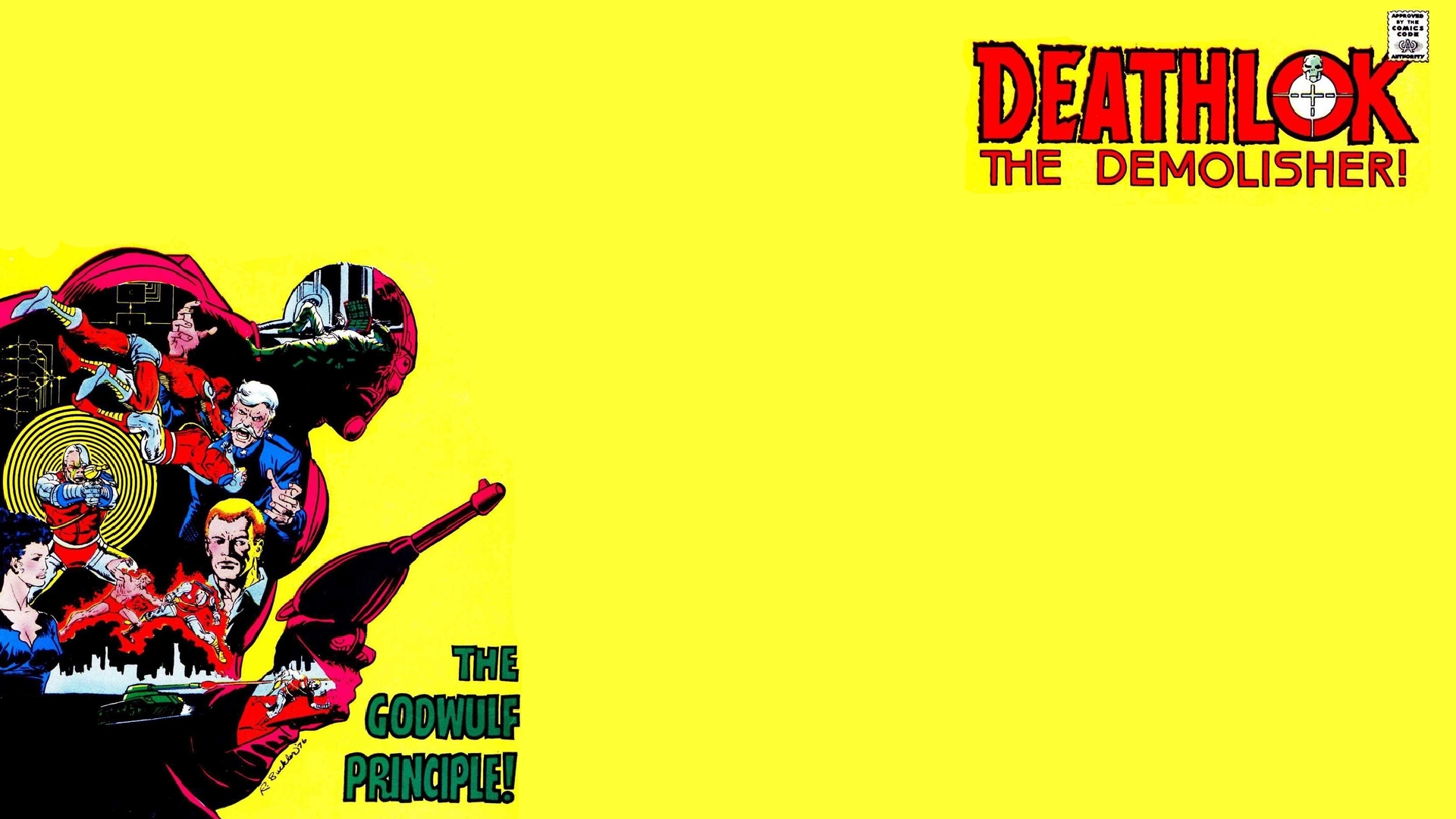 Description: A yellow background with a picture of a man holding a gun and a comic book cover with the title deathlok the demolisher.