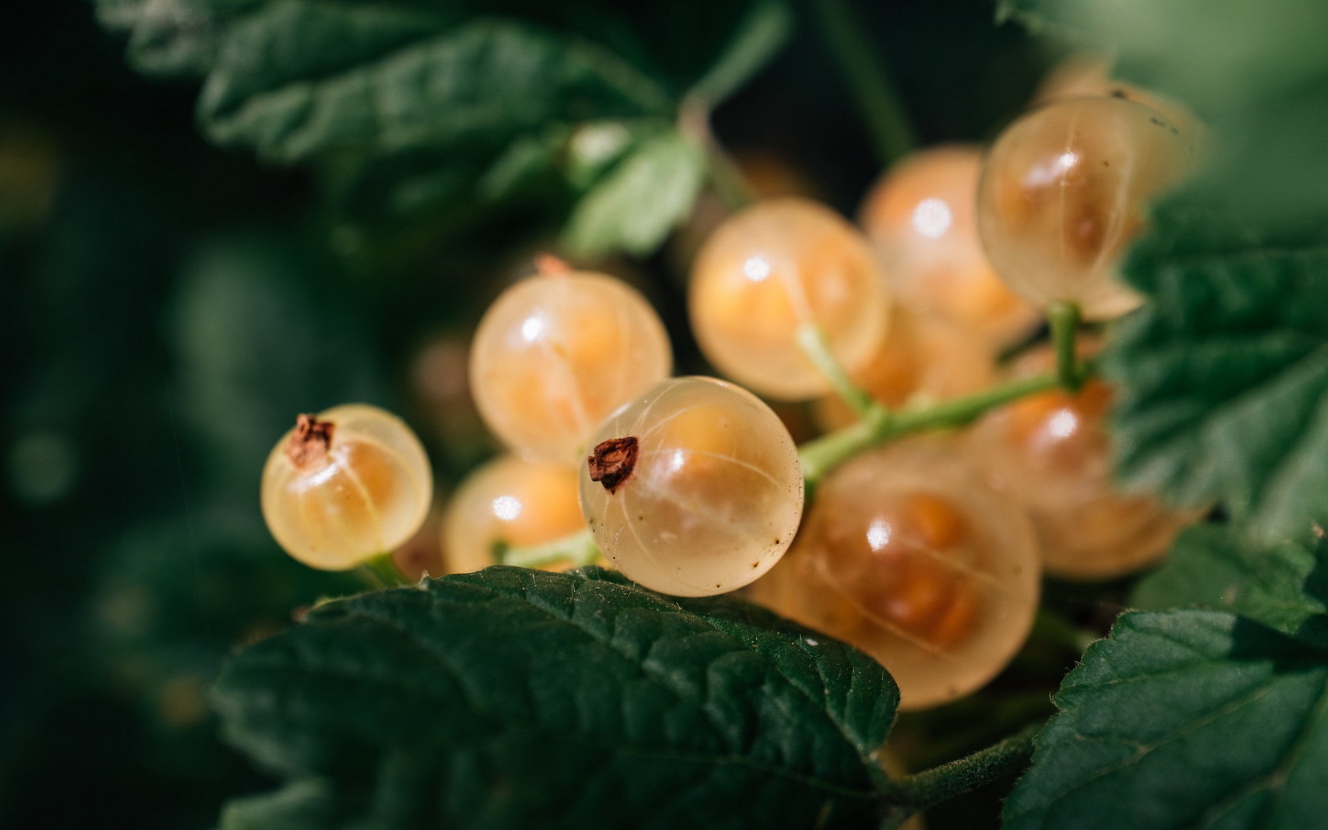 Description: A bunch of yellow berries on a green leafy branch with leaves around them and a red spot on the center of the fruit.