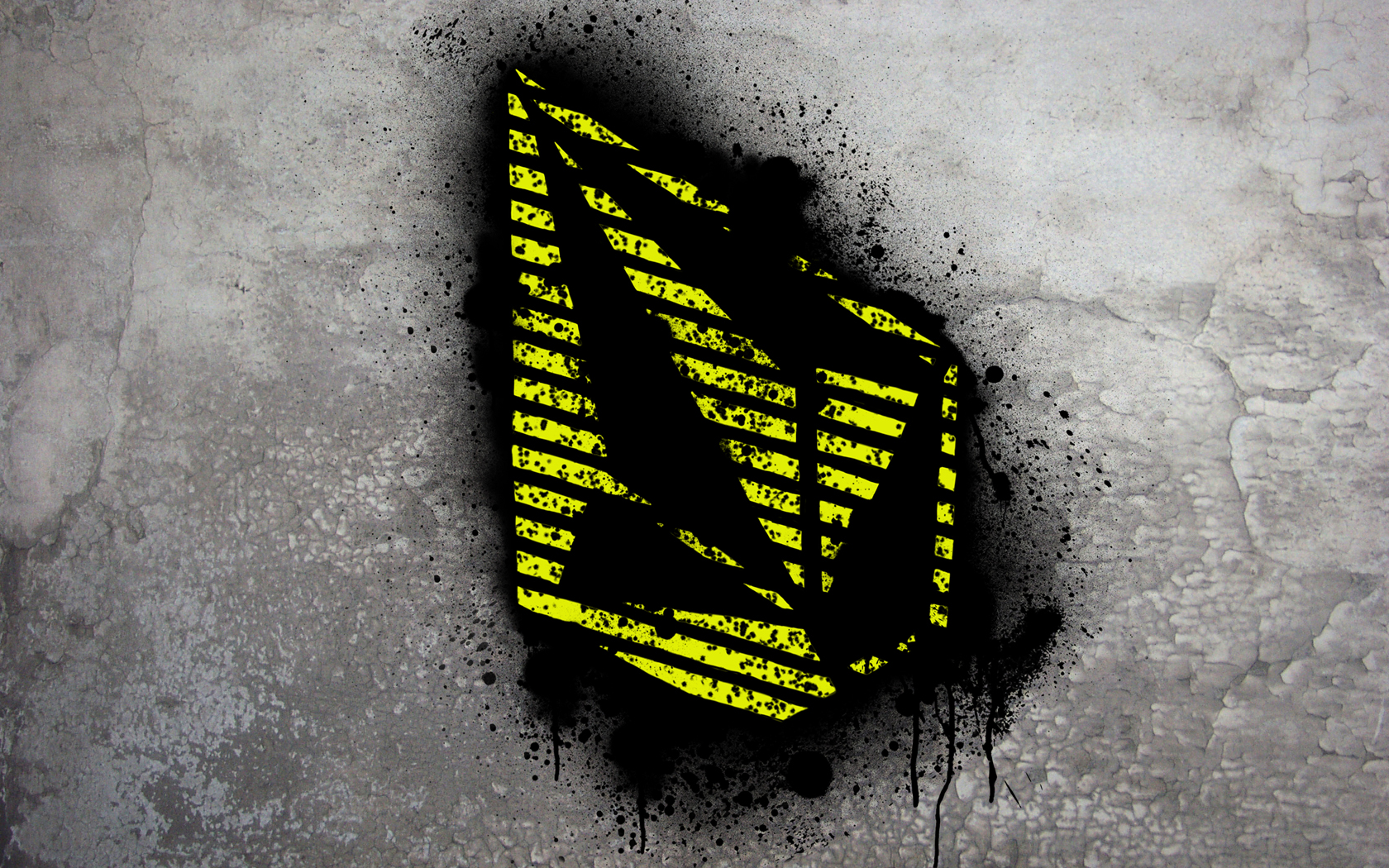 Description: A yellow and black piece of art on a wall with black paint on it and a black and yellow marker.