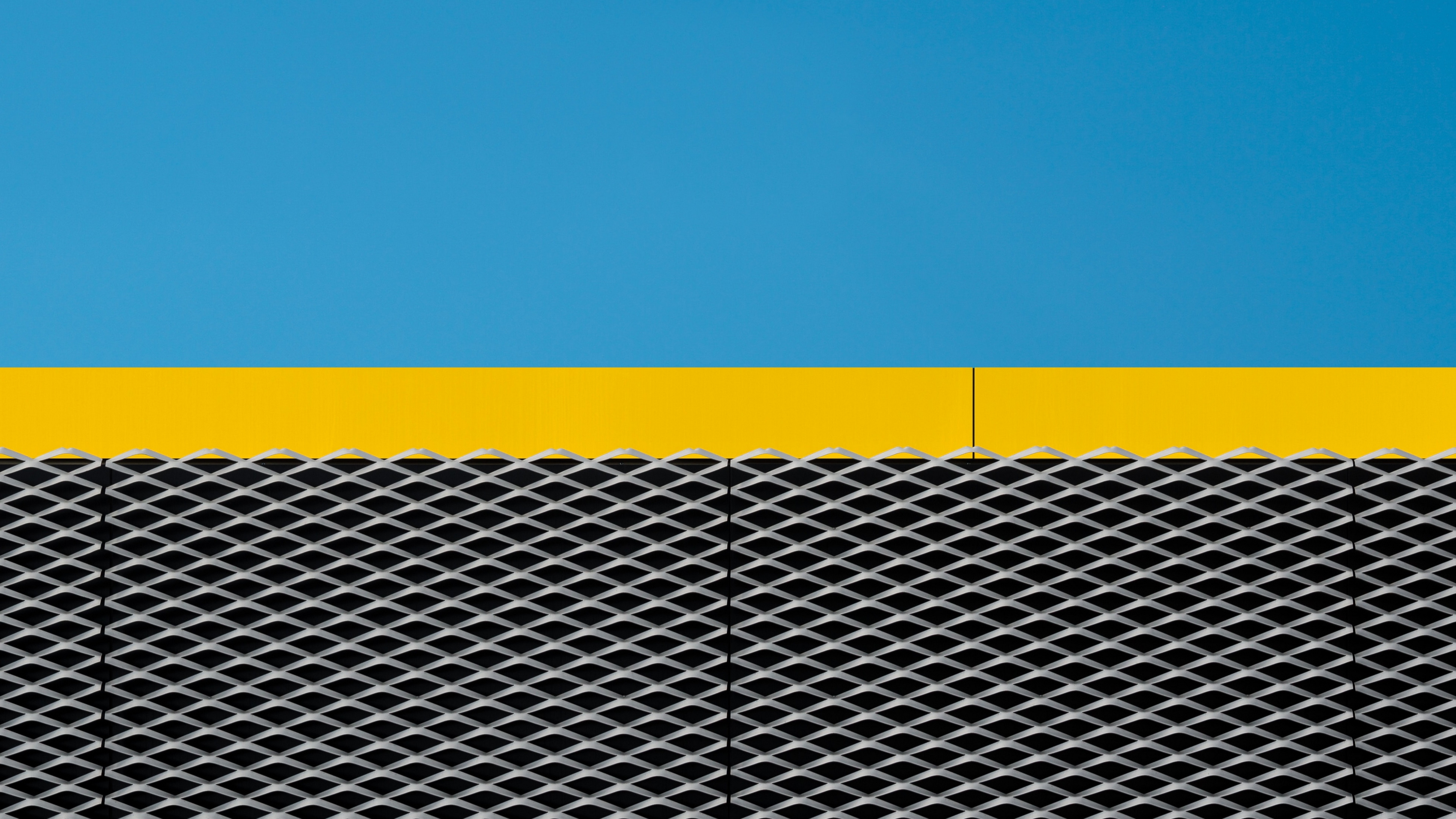 Description: A yellow and black building with a clock on it's side and a blue sky in the background.