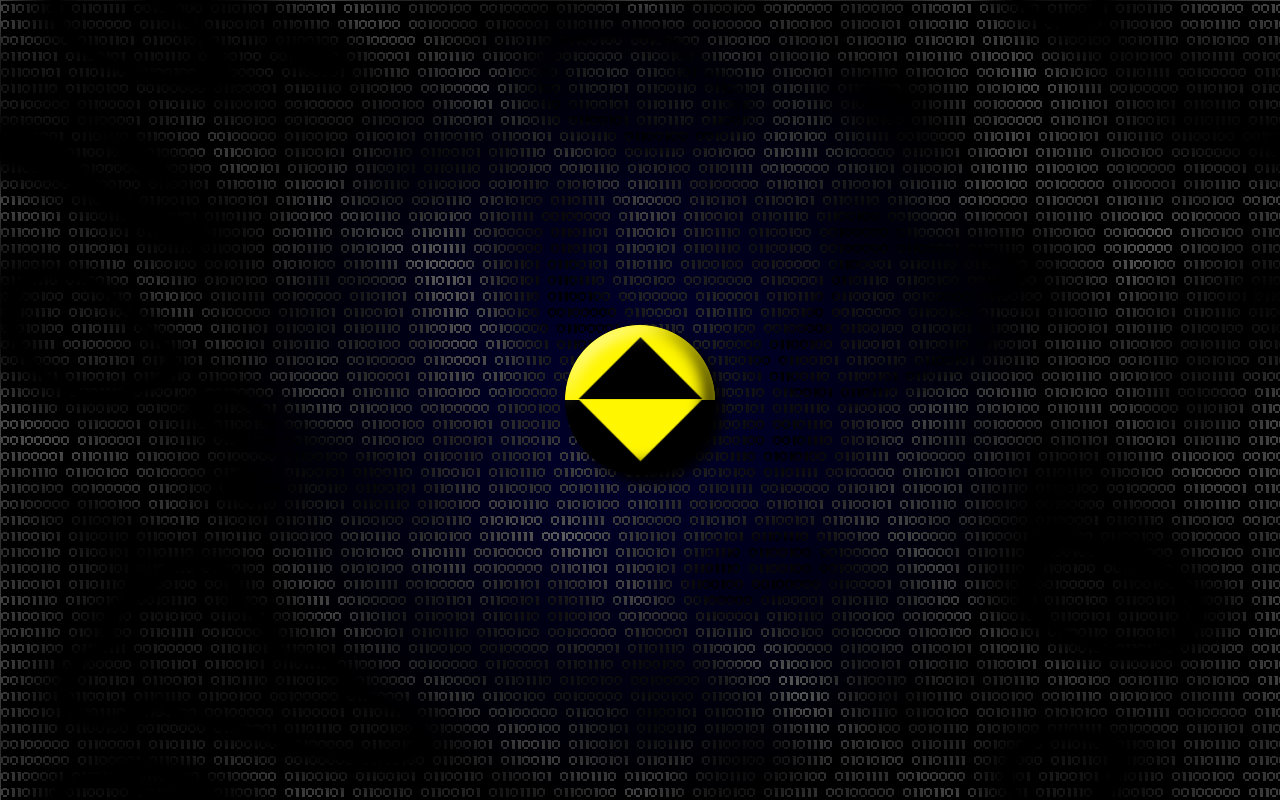 Description: A yellow and black logo on a black background with numbers in the background and a black background with a yellow triangle.