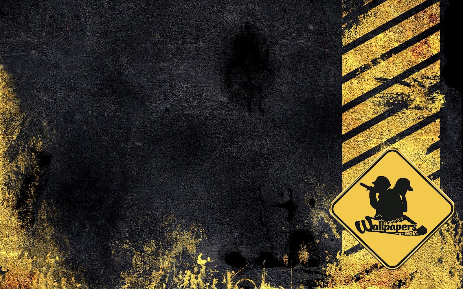 Description: A yellow and black sign on a black and yellow wall with a yellow stripe on it and a black and yellow background.