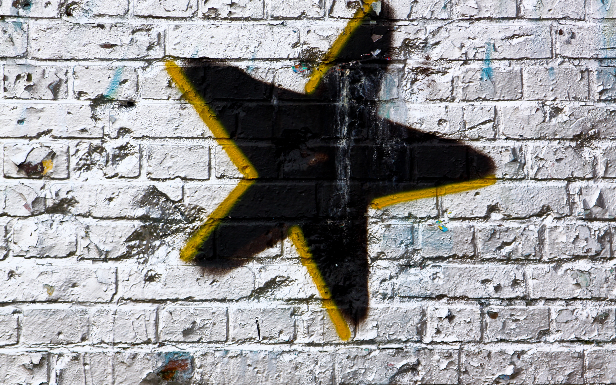 Description: A yellow and black star painted on a brick wall with graffiti on it and a black and yellow star.