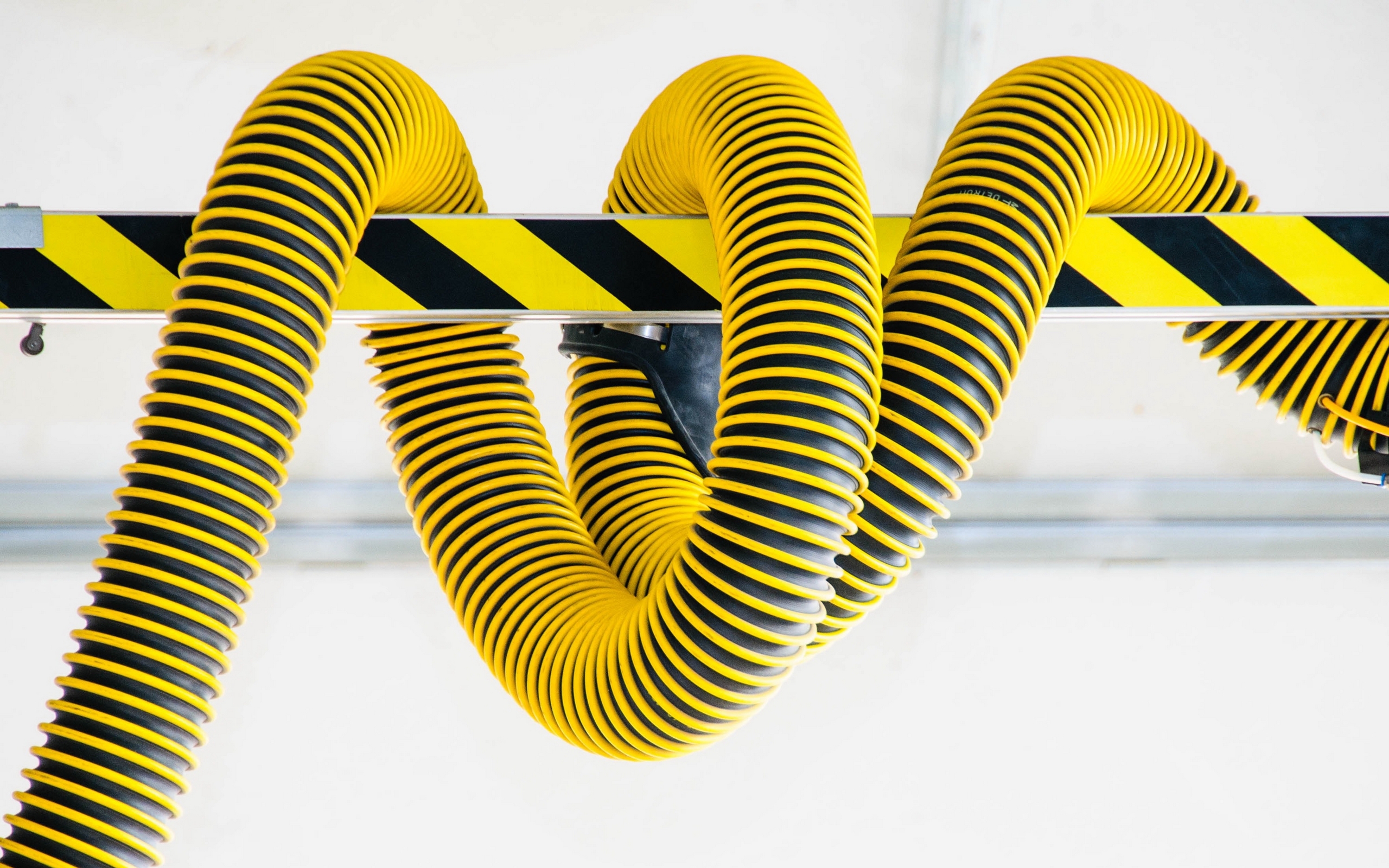 Description: A yellow and black striped object hanging from a hook on a wall with a black and yellow striped object hanging from it.